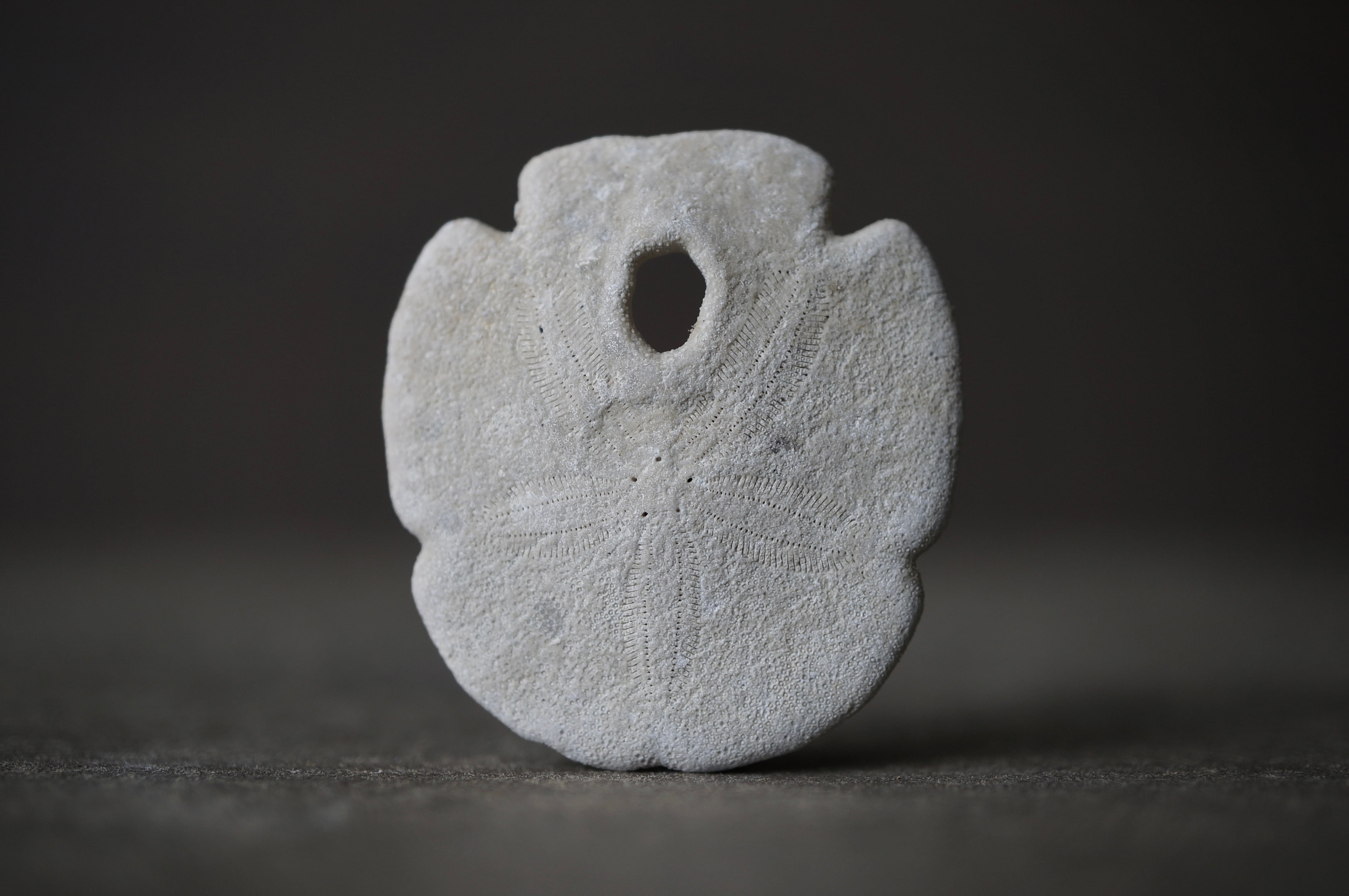 規則的に配置された花弁状の模様と意図的に穿たれたような孔が、ミステリアスな印象を与える、大変珍しいウニ化石です。