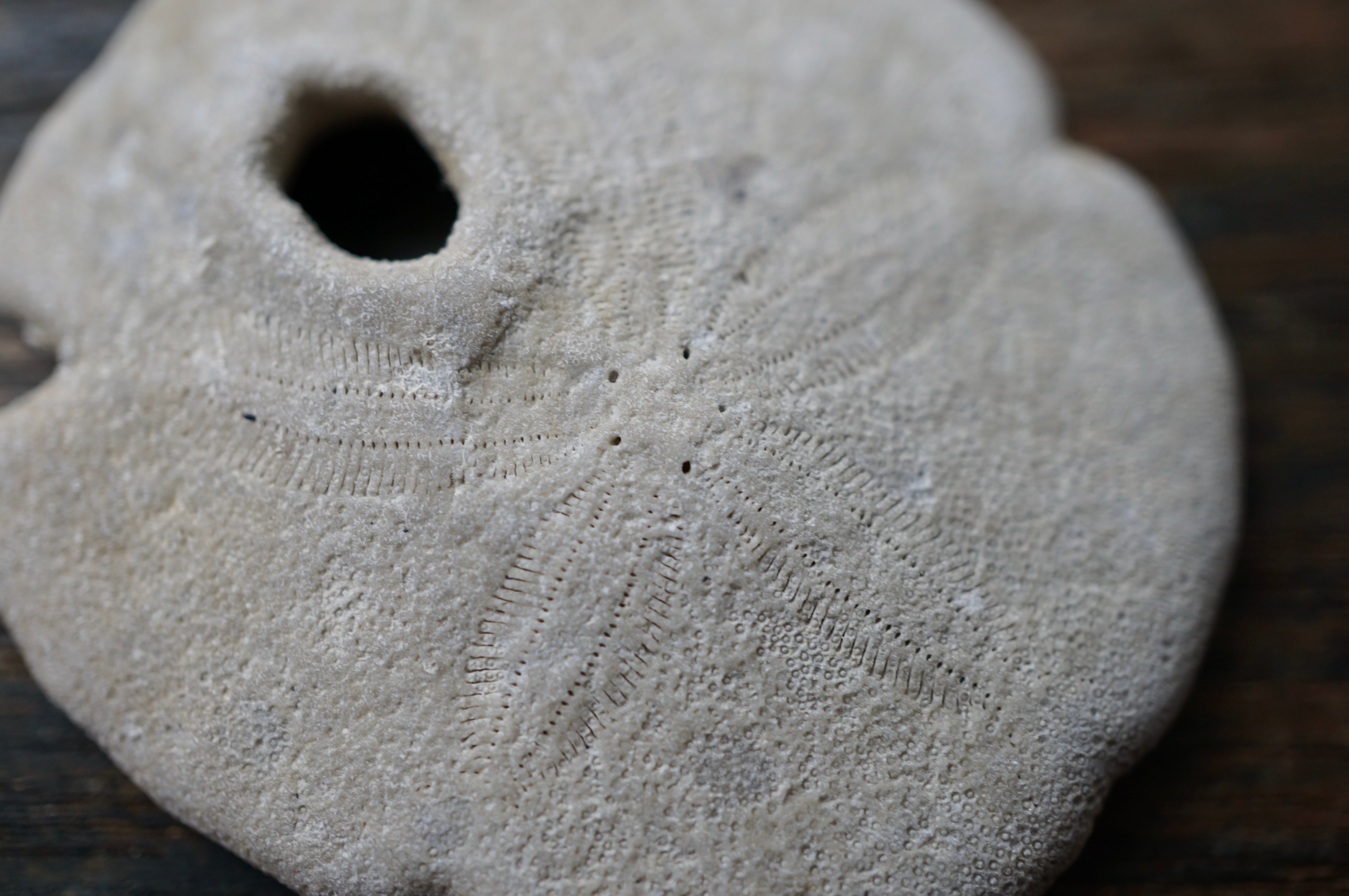 特に本種では、中央から放射状に広がる花弁状のペタロイド構造とともに、殻に開いた孔(ルヌール)が明瞭に発達しています。