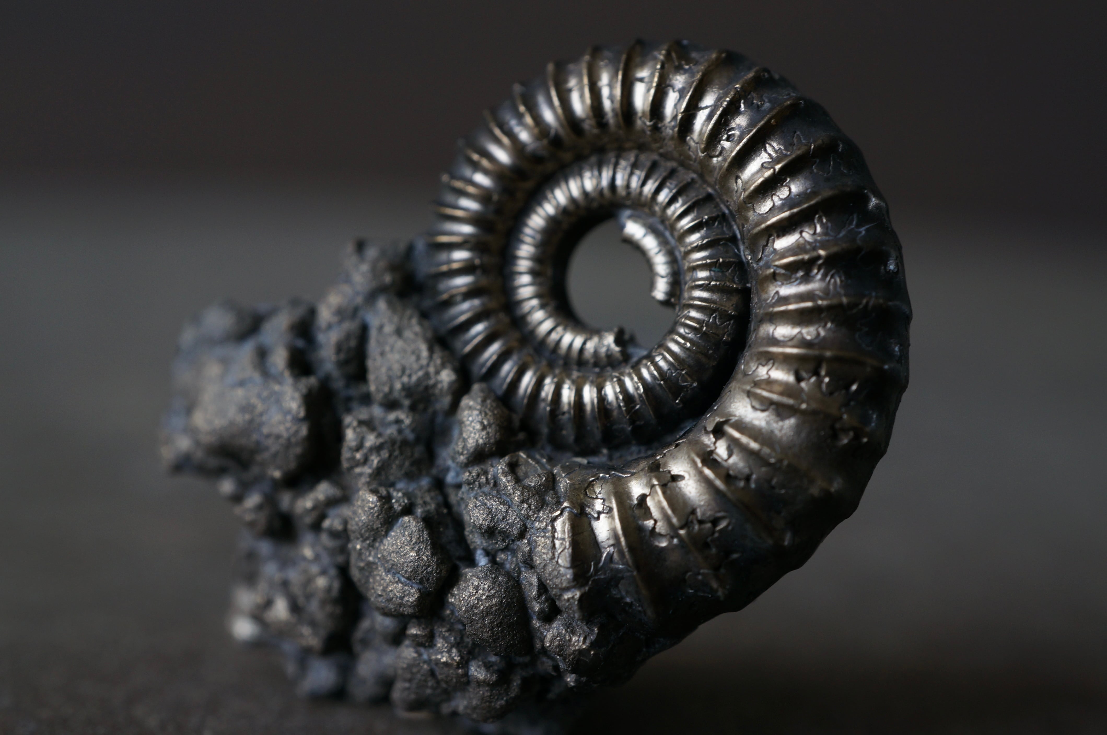 ジュラ紀(約2億130万年前から約1億4550万年前)の海に生息していたアンモナイトの遺骸が、バクテリアによる分解と鉄イオン/硫化物の反応により、黄鉄鉱によって置換され、金属光沢をもつ硬質な物質へと変化したものです。