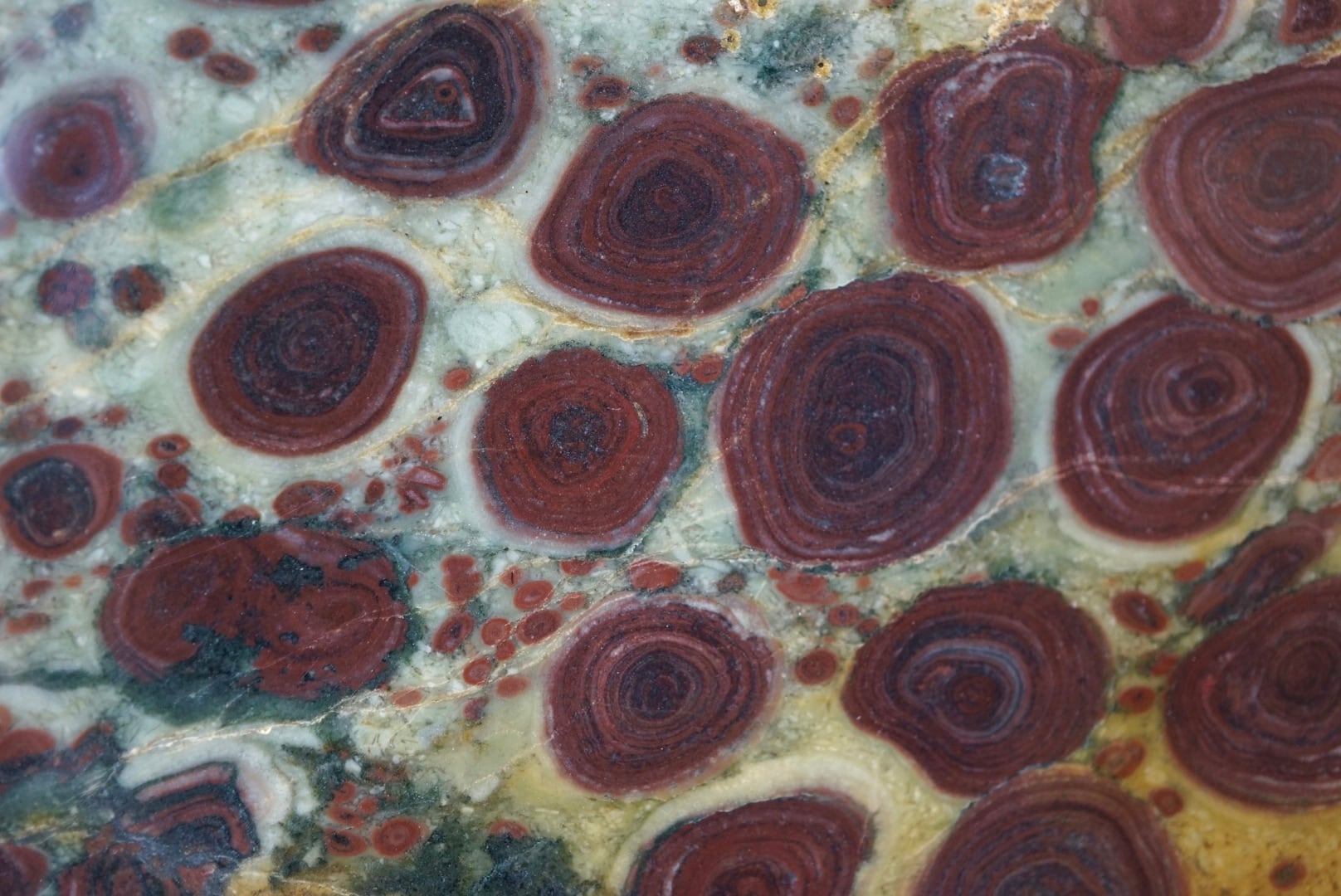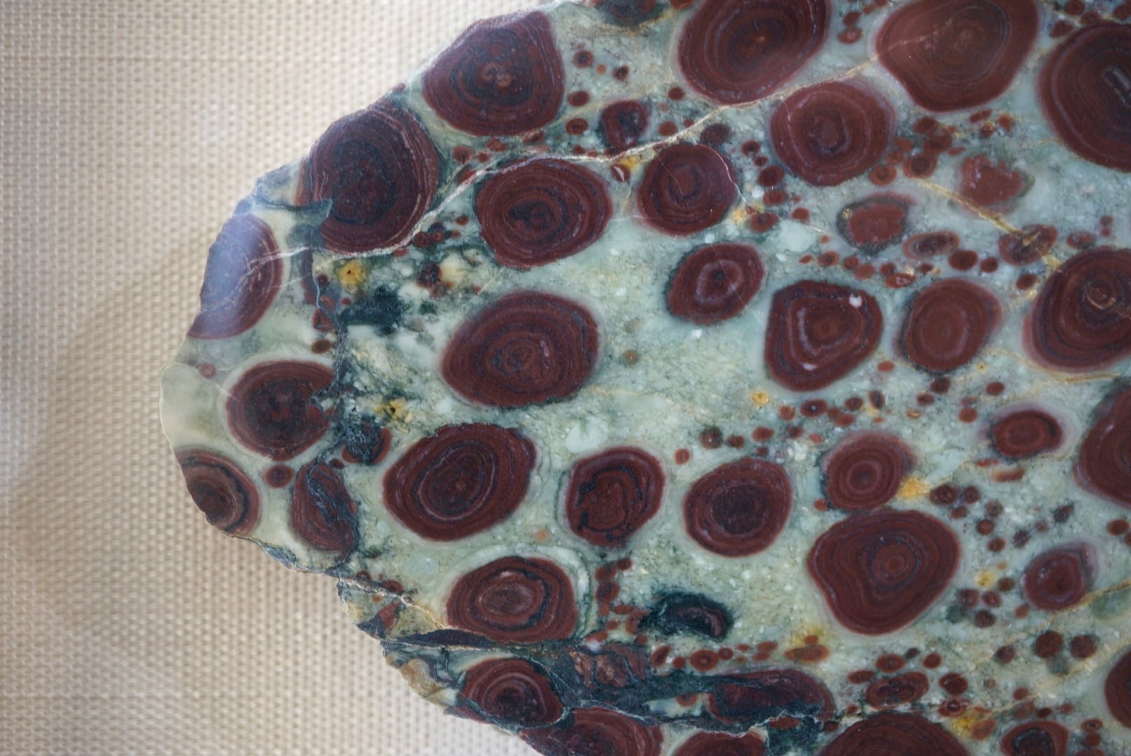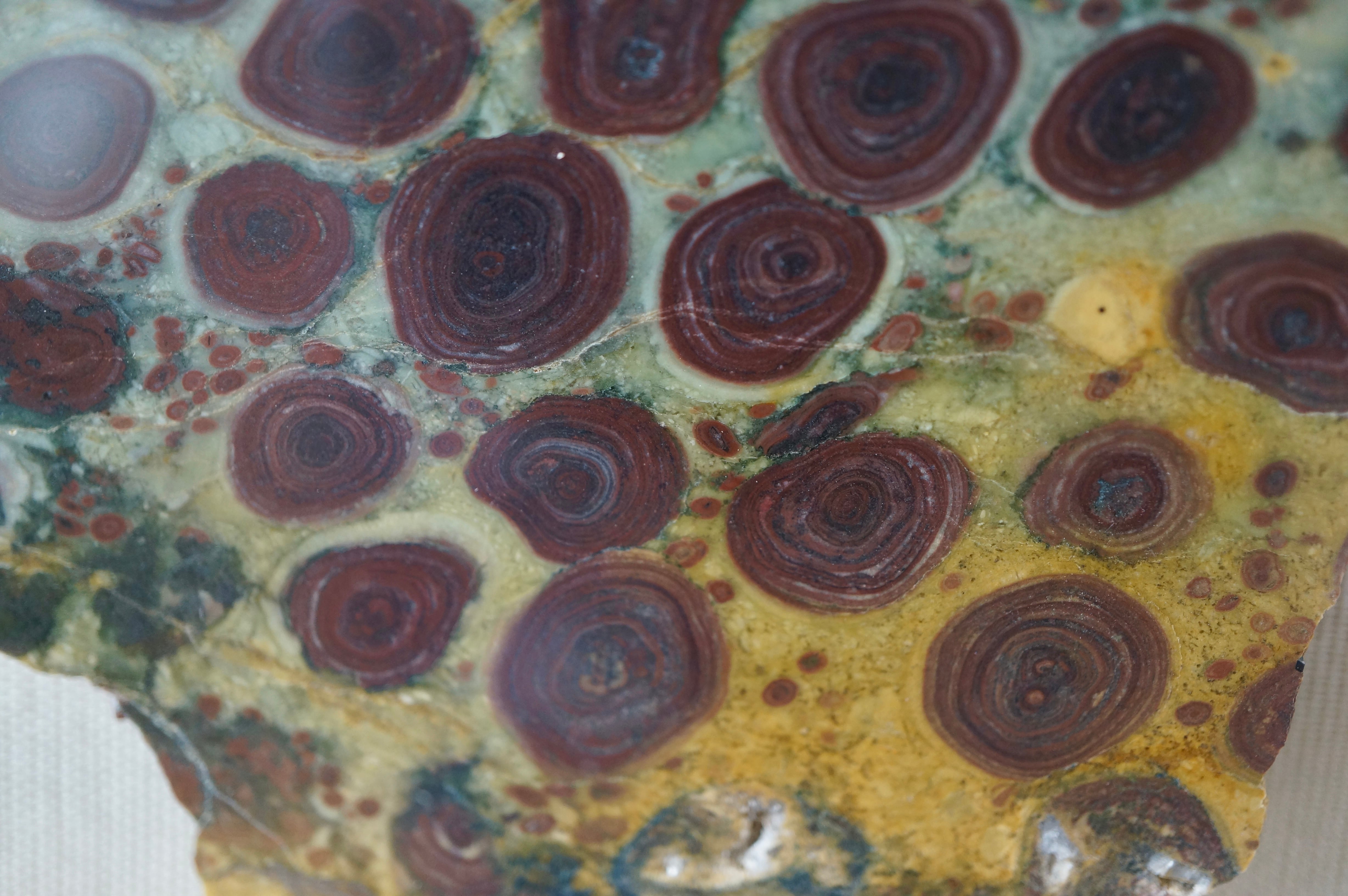 黄土から翡翠のような寒色へのグラデーションが美しい母岩上に、花のような美しい同心円状模様が絵画的に浮かび上がった一枚です。