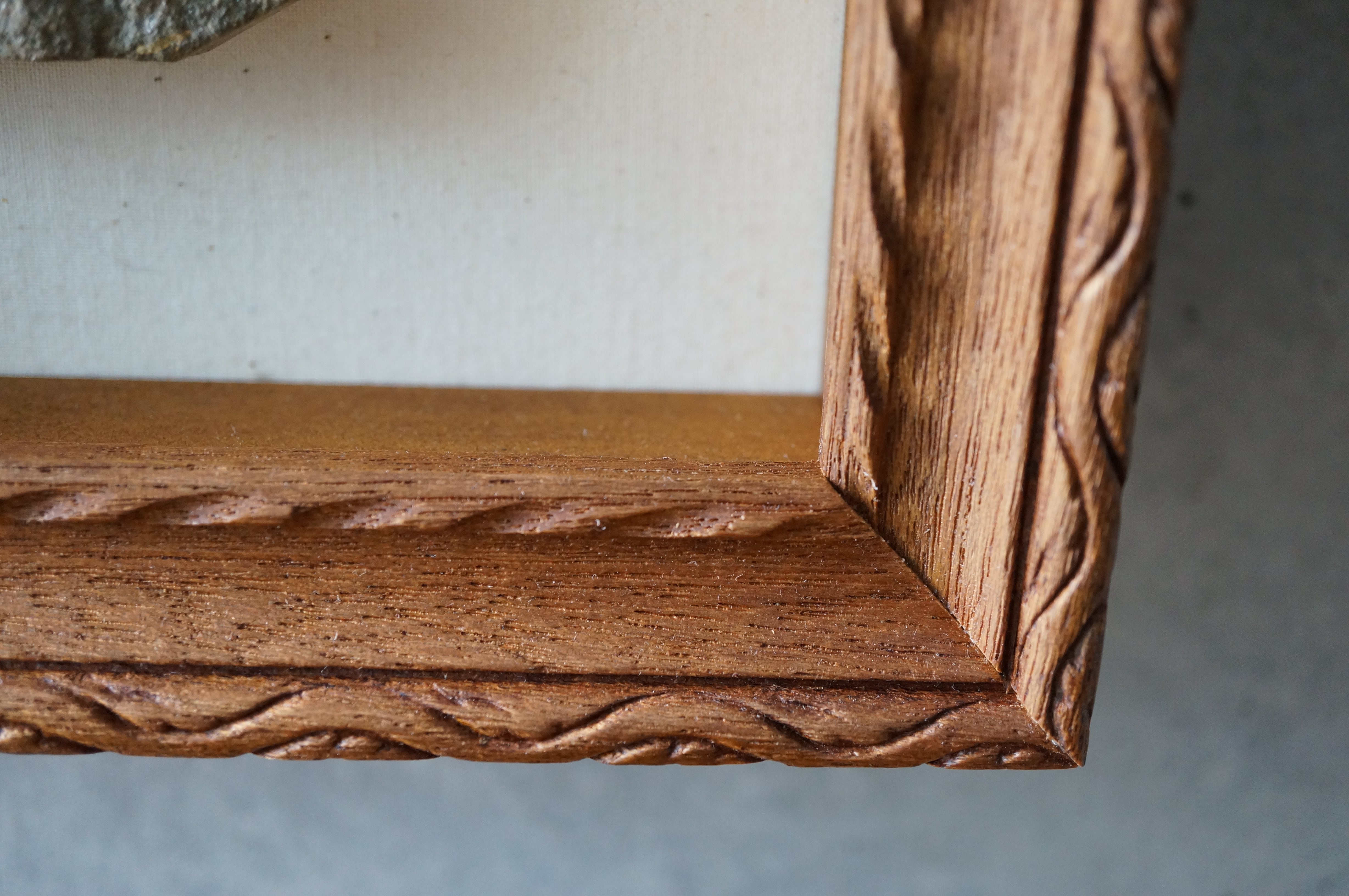 天然木材を使用したデッドストックフレームを用い、石の表現を引き立てるよう1点ずつオーダーメイドで額装しています。