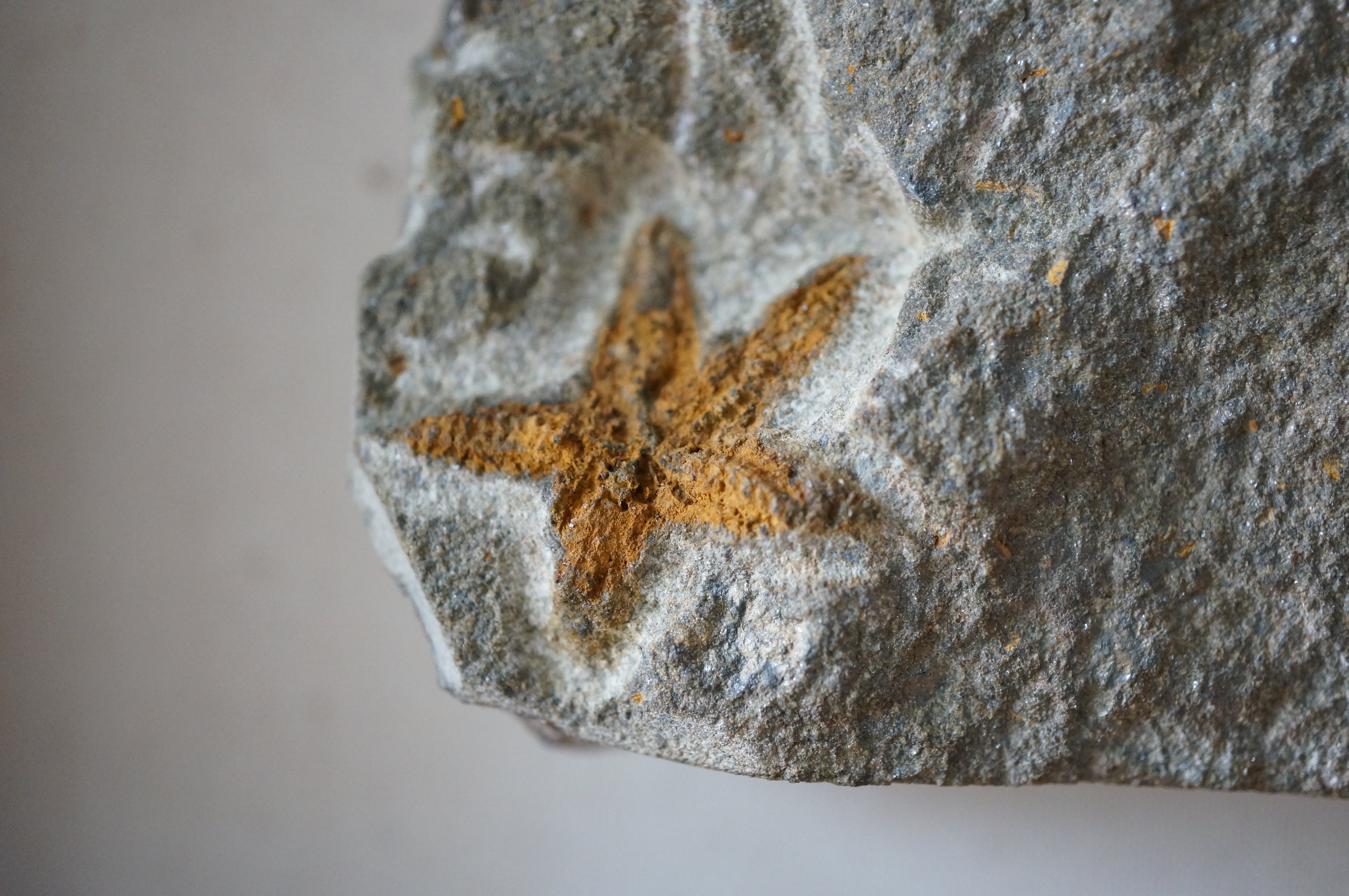 モロッコ南東部、オルニフ周辺に広がる古生代層から産出した、オルドビス紀(約5億500万〜4億4600万年前)のヒトデ化石 Petrastar sp.です。