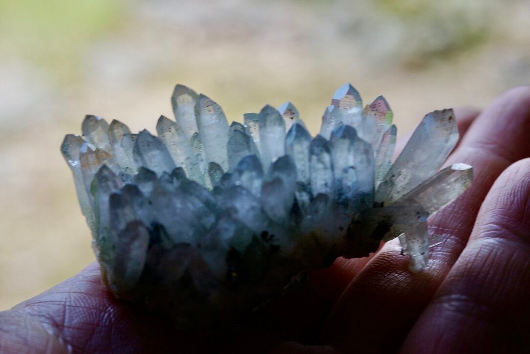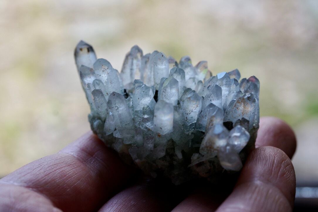 光に透かすとクローライトの緑青がクォーツにぼんやりと馴染みます。