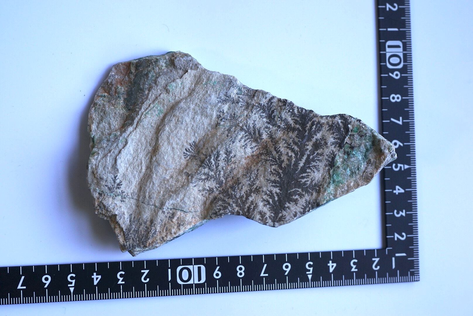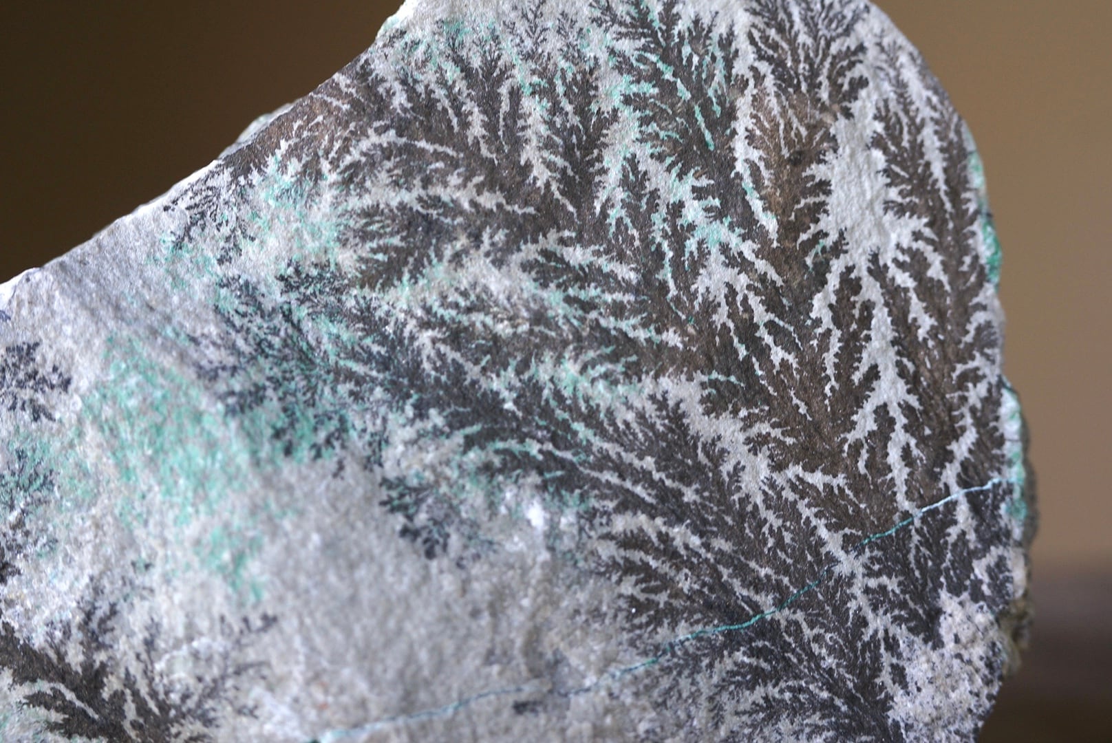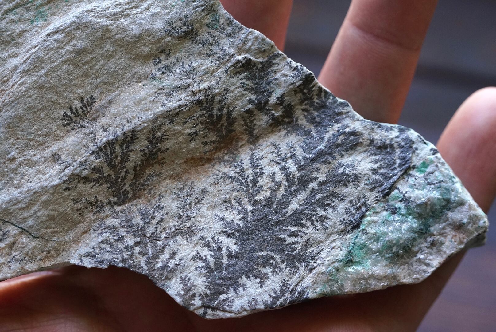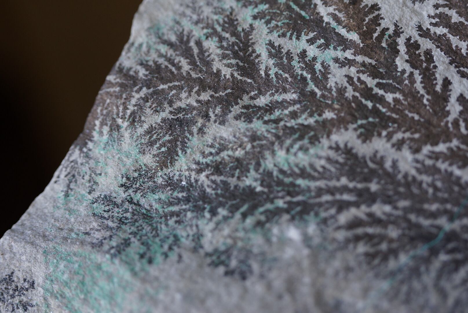 植物の化石のように見える模様は二酸化マンガンが岩の間に染み込んでできたもの。