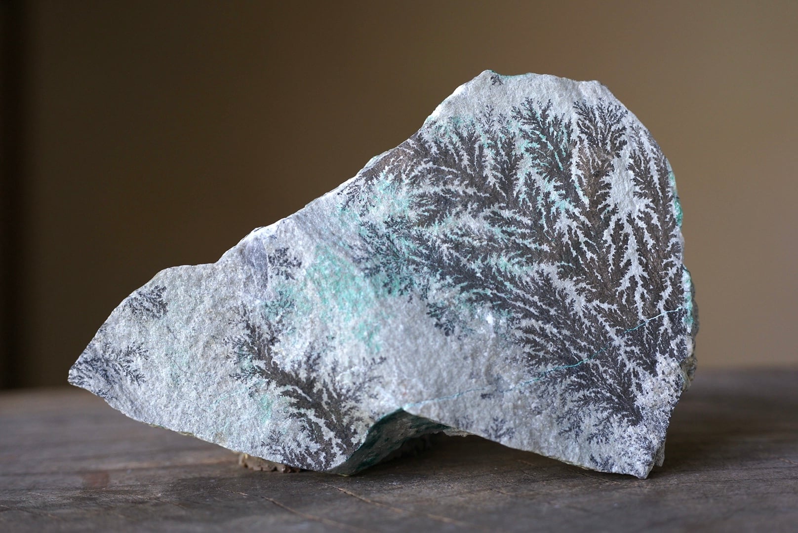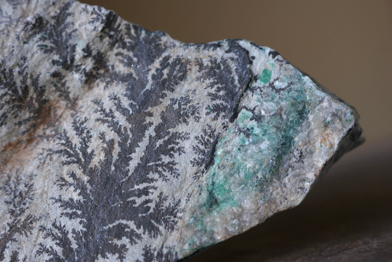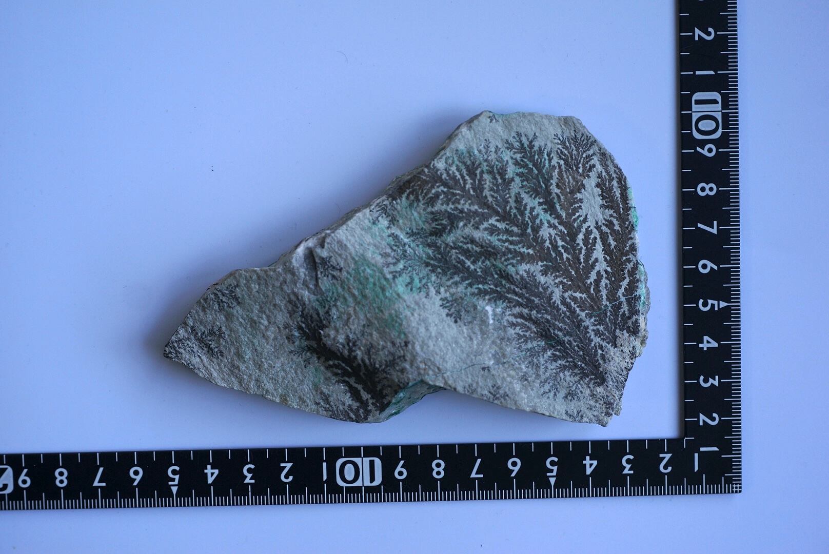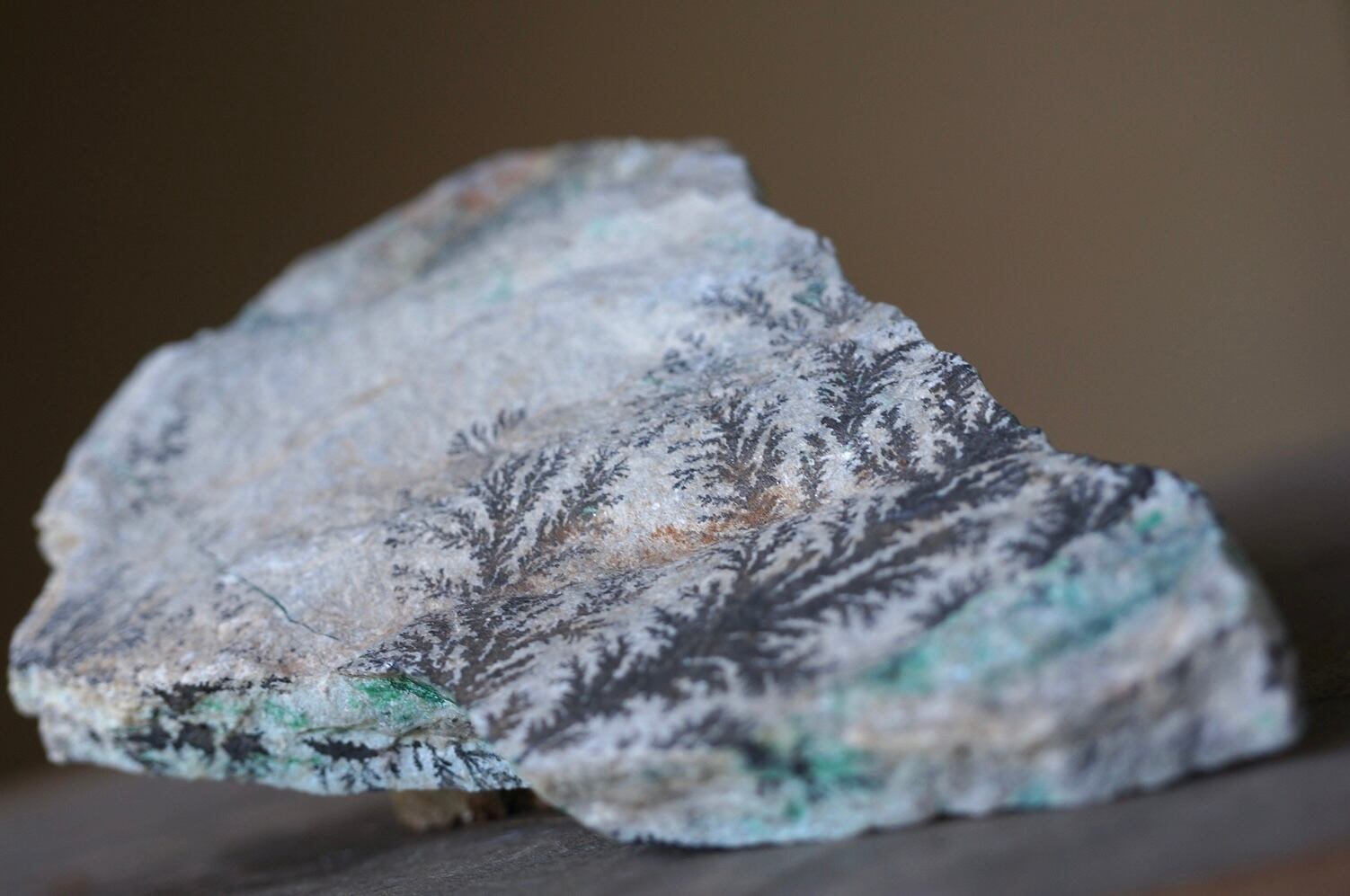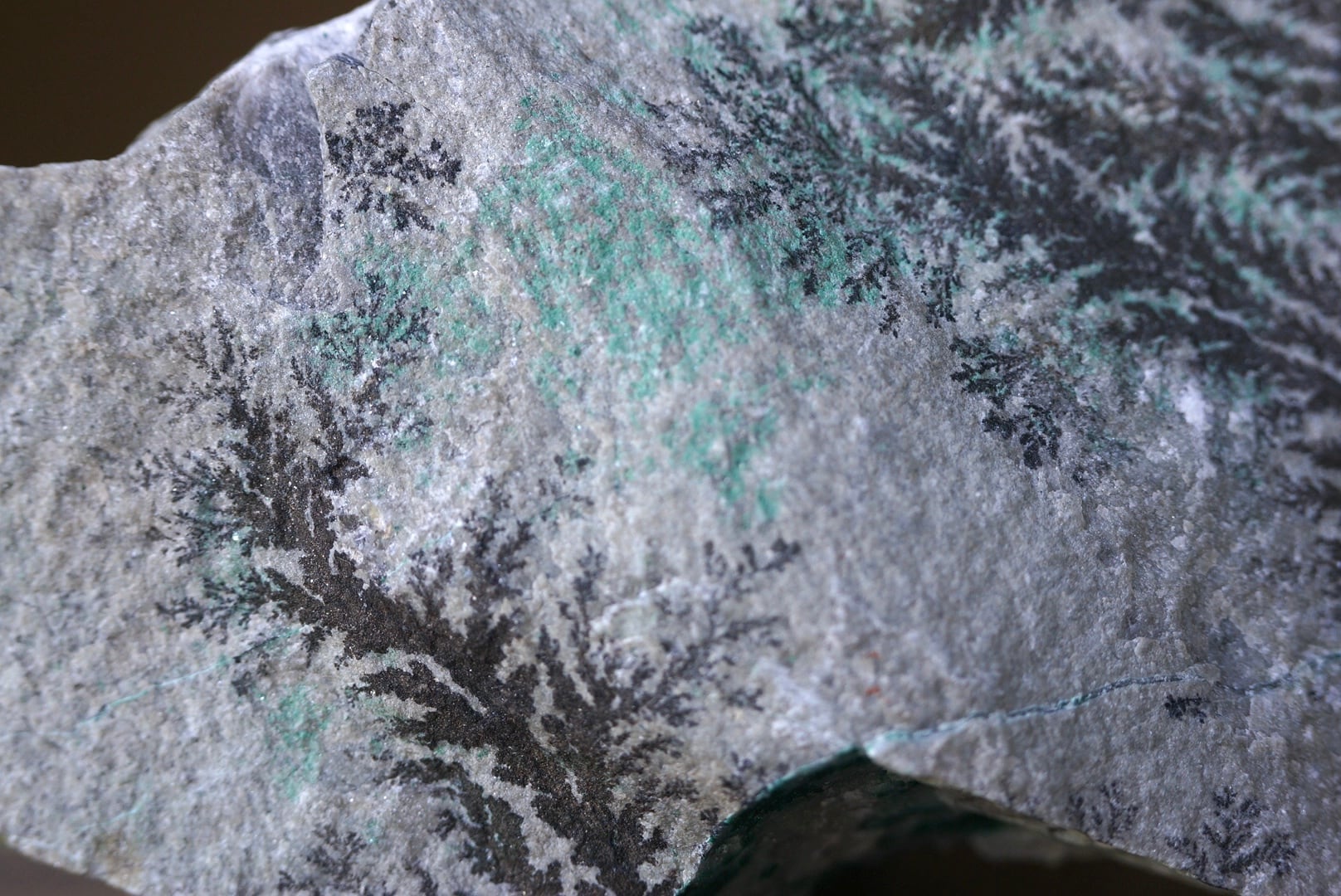植物の化石のように見える模様は二酸化マンガンが岩の間に染み込んでできたもの。