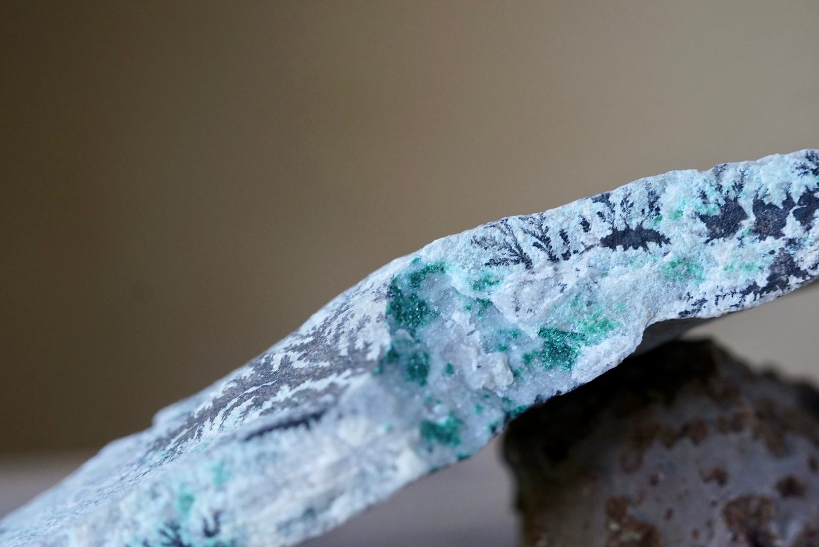 鮮やかな水色のクリソコラと鮮明なデンドライトが共生しています。