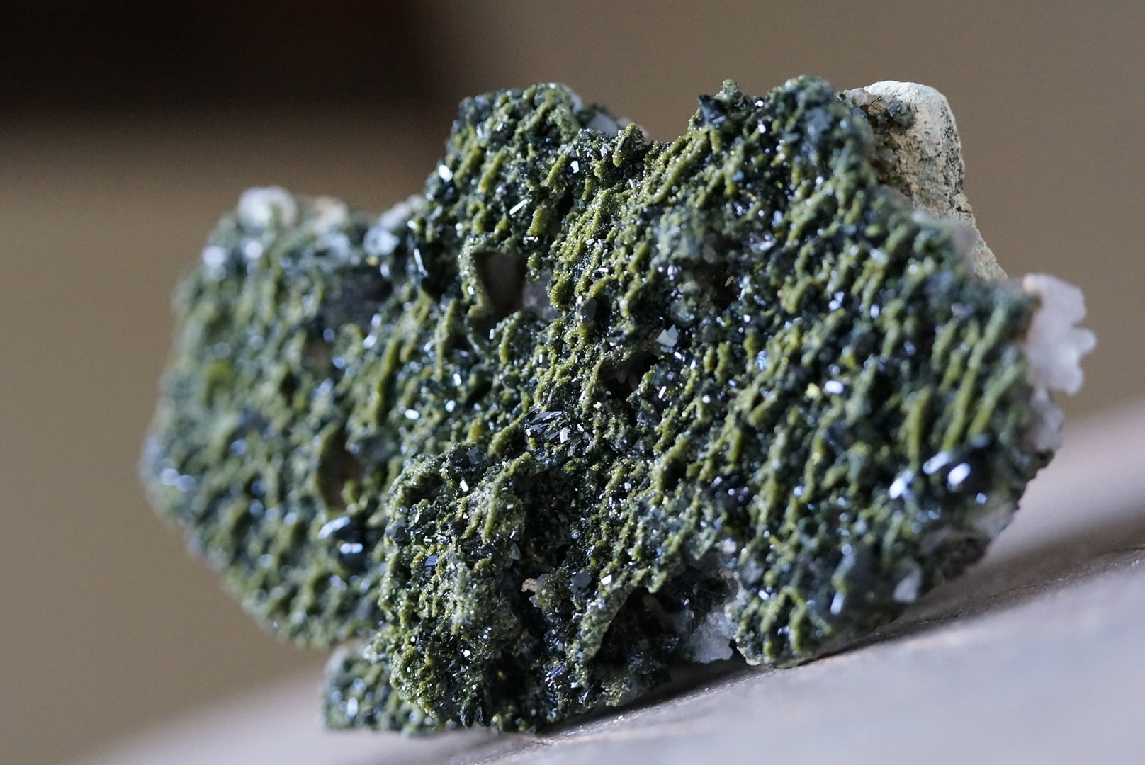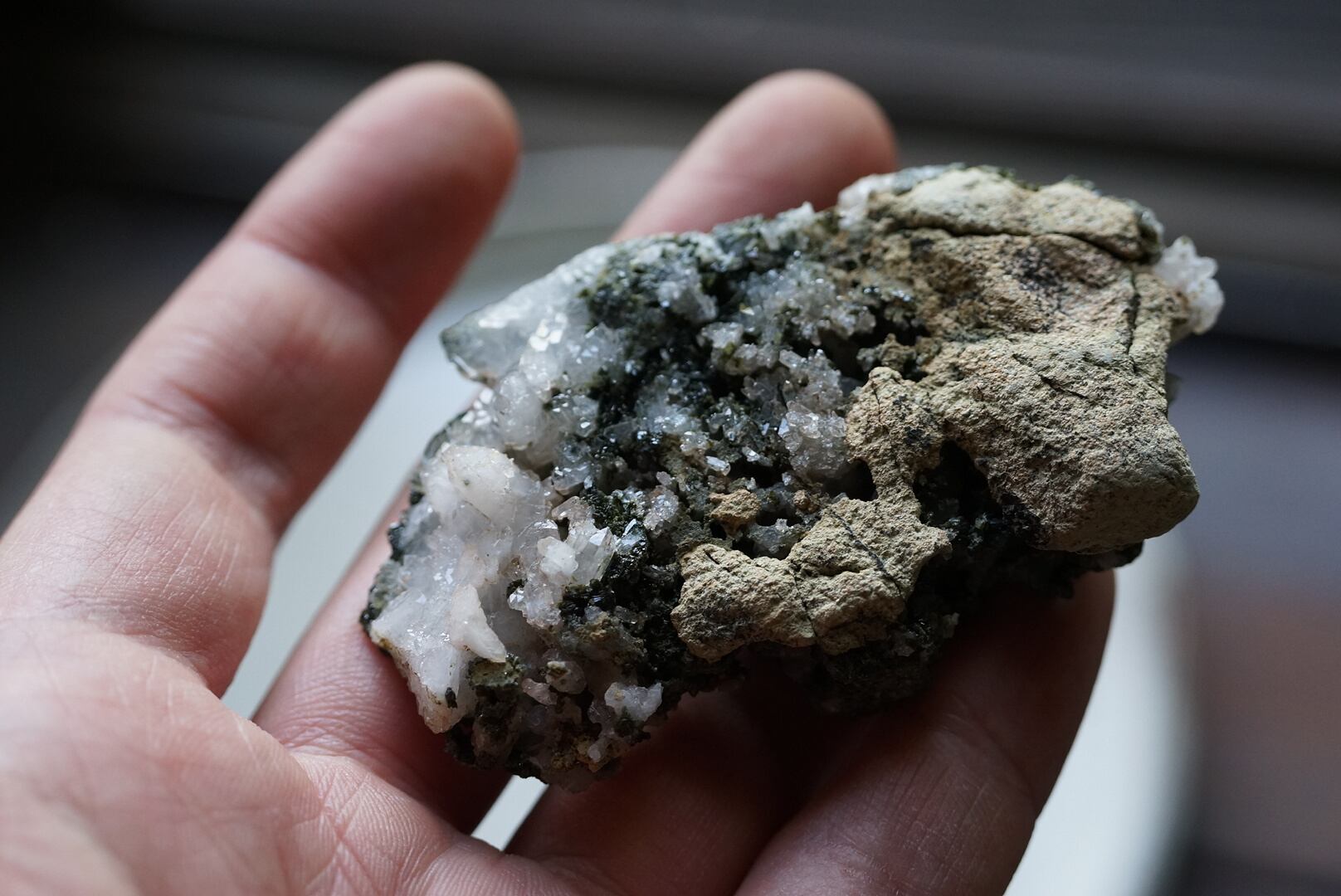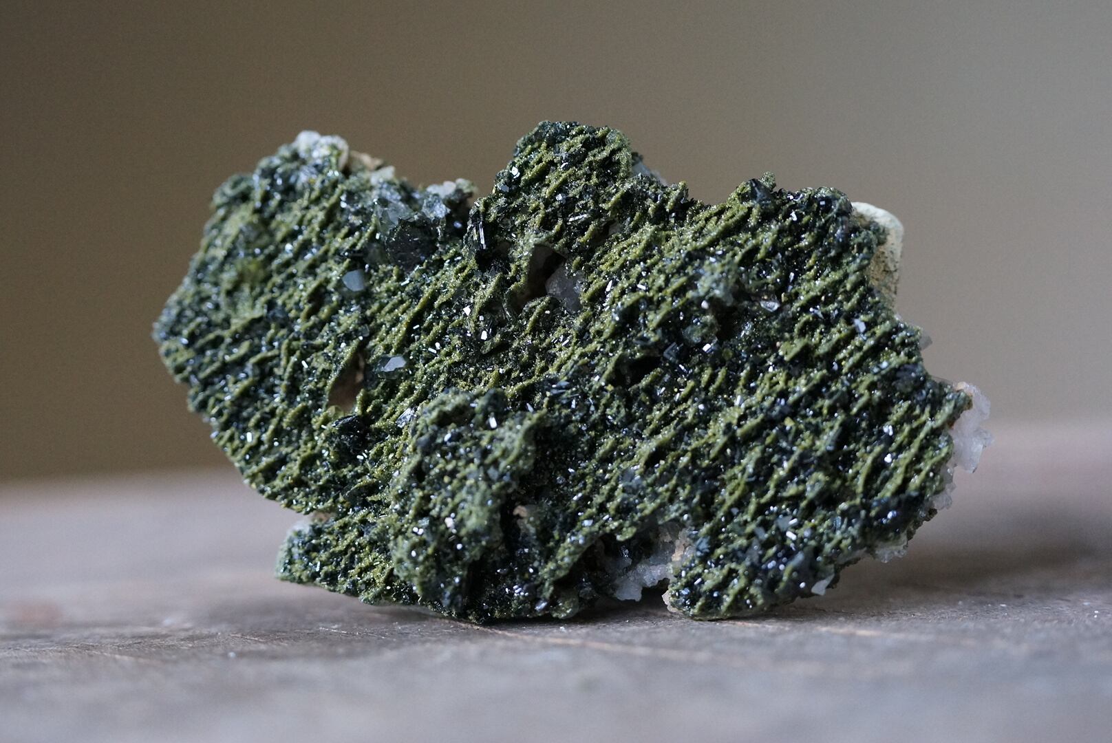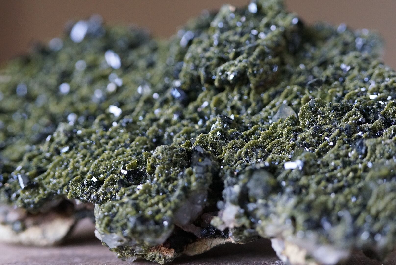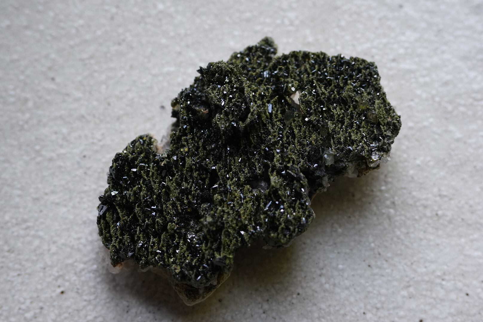 キラキラと細やかな結晶がびっしりと集合した、ドゥルージーなエピドート/クォーツです。