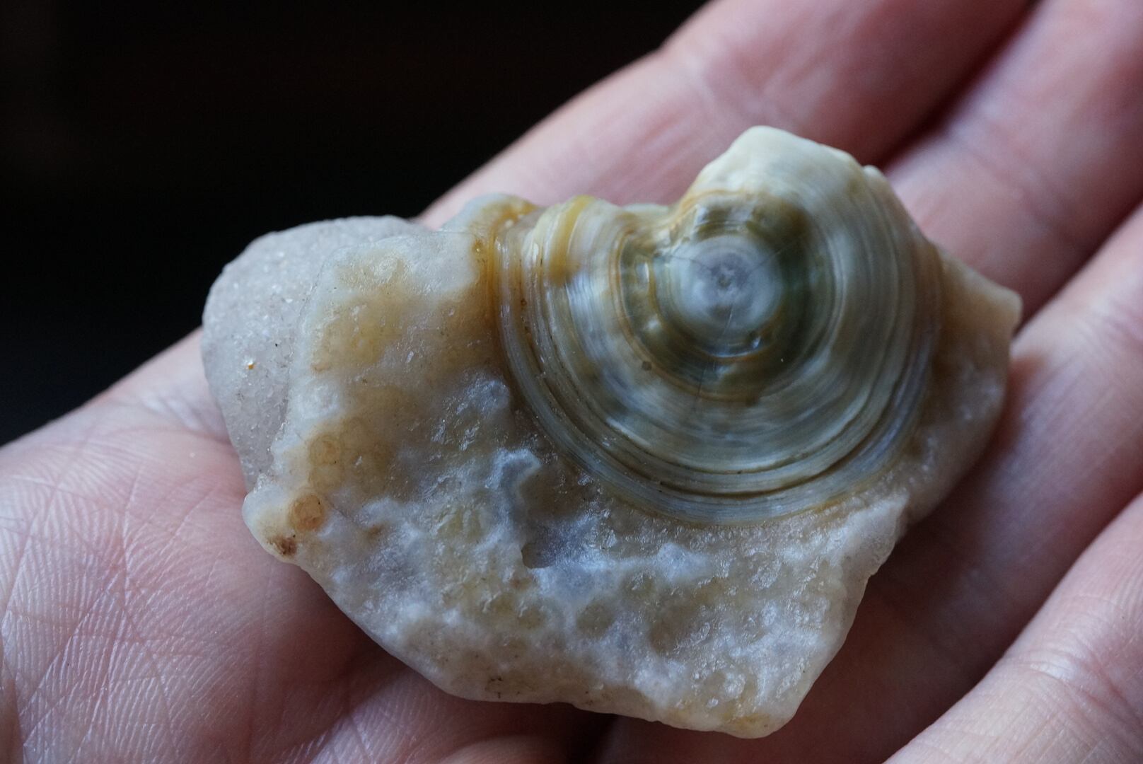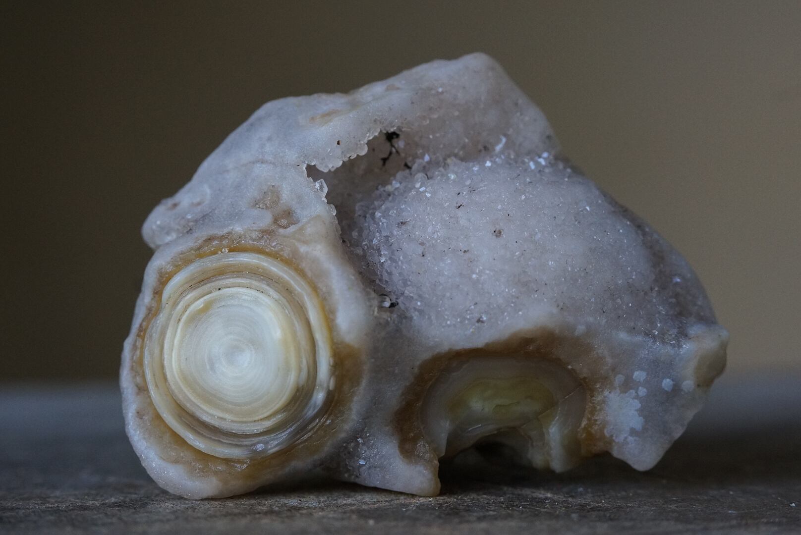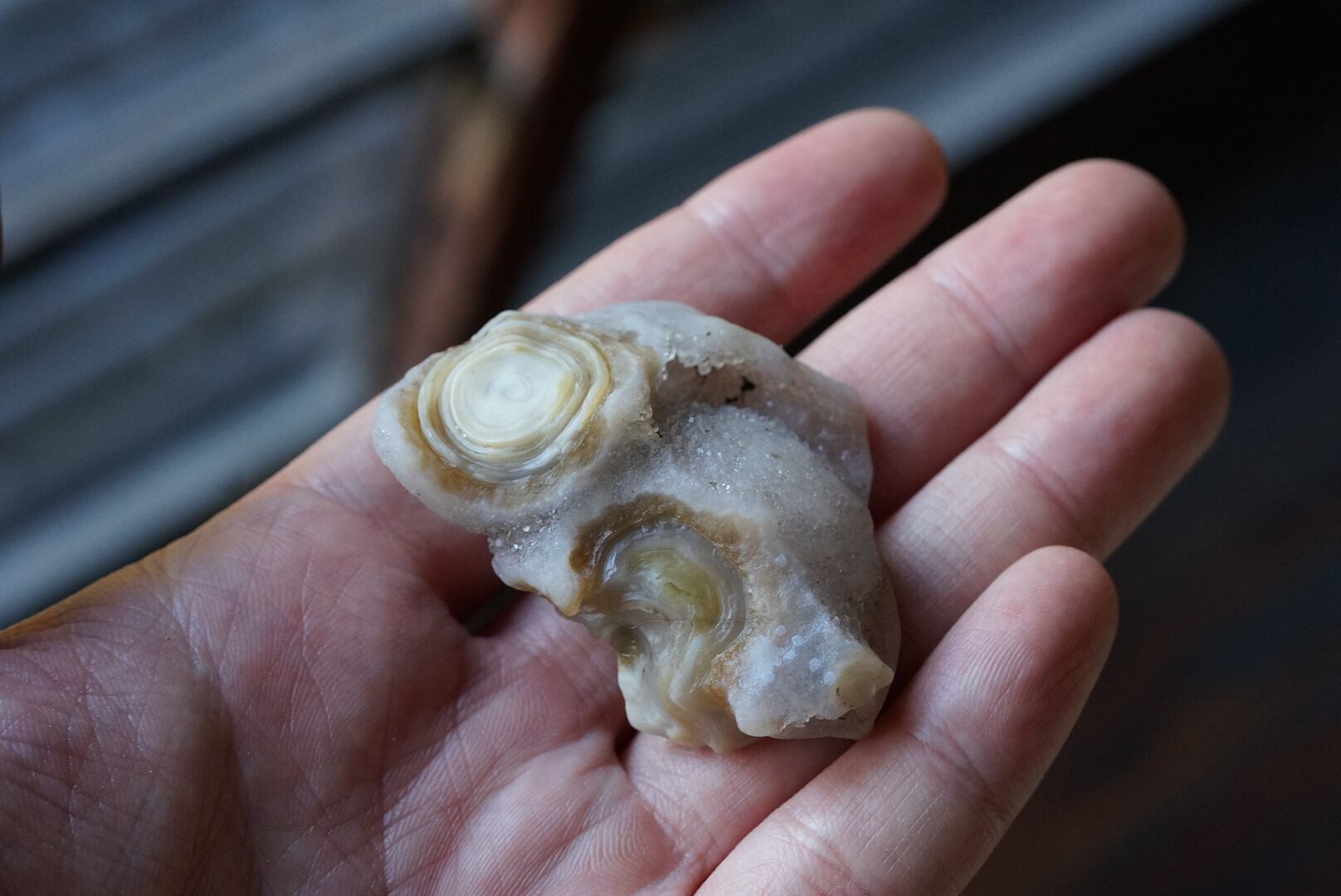 揺らぎのある石英質の体に大きな目玉模様が表れたゴビアゲートです。
