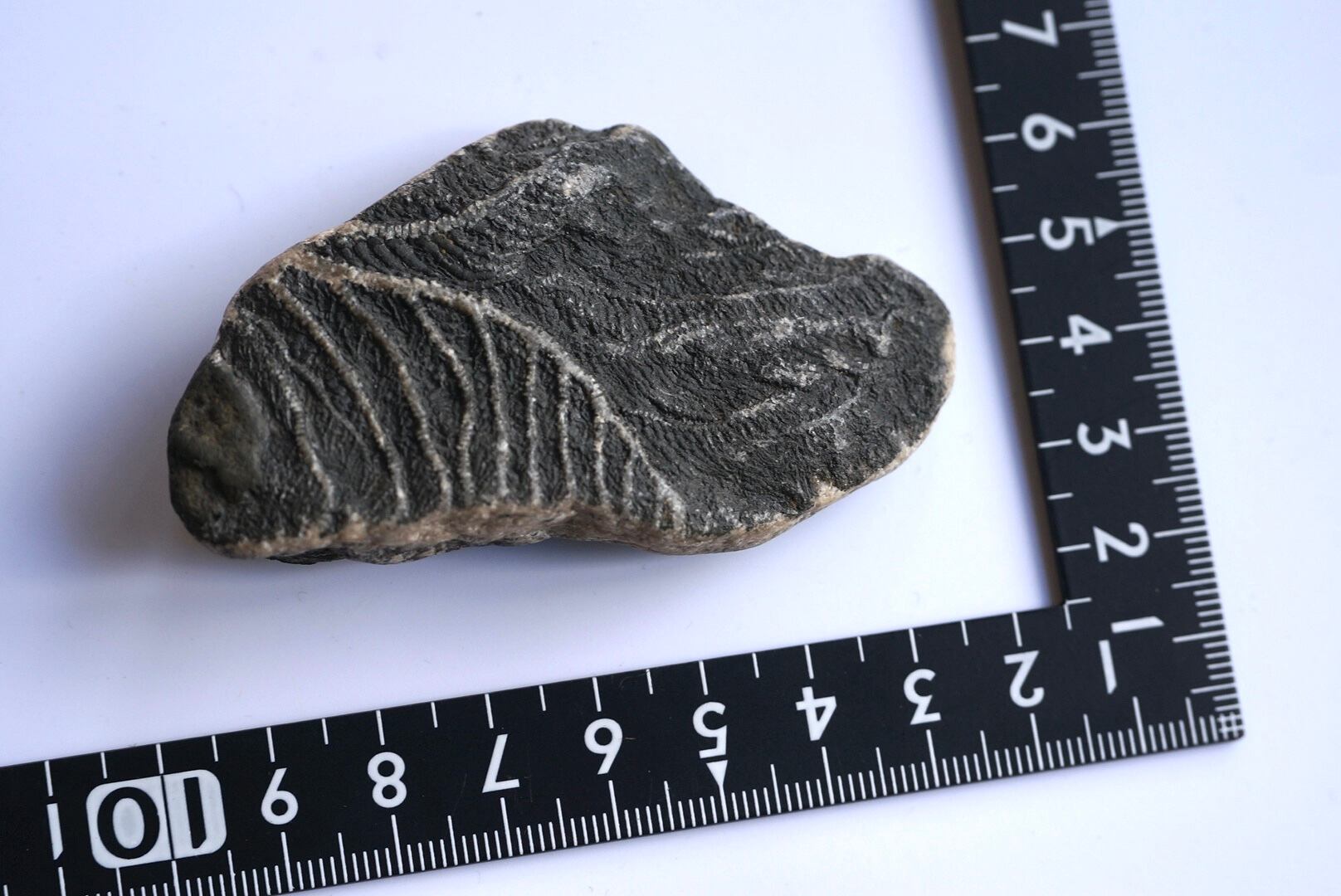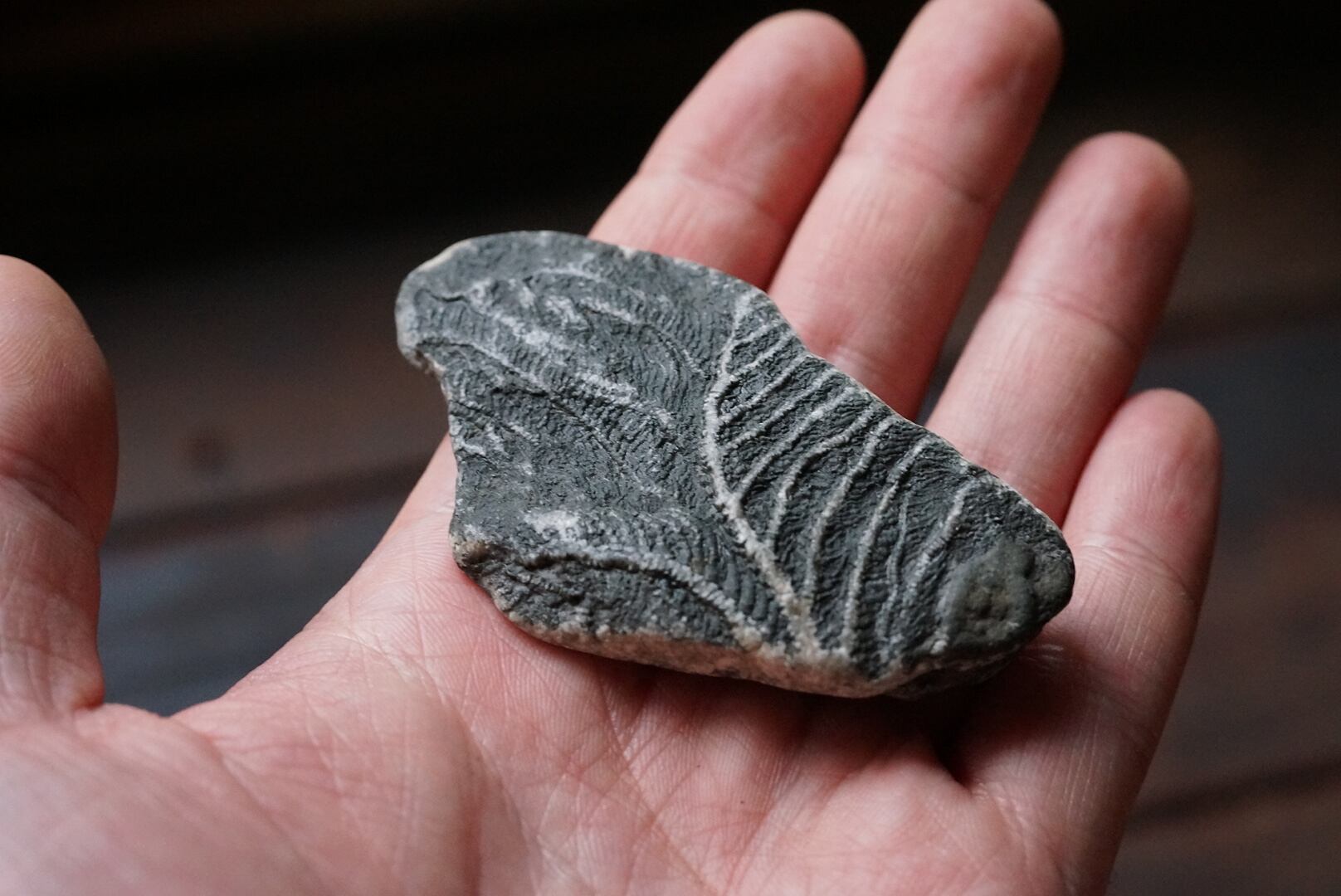 羽のようなウミユリの冠部が木の葉のような石片に美しく表れています。