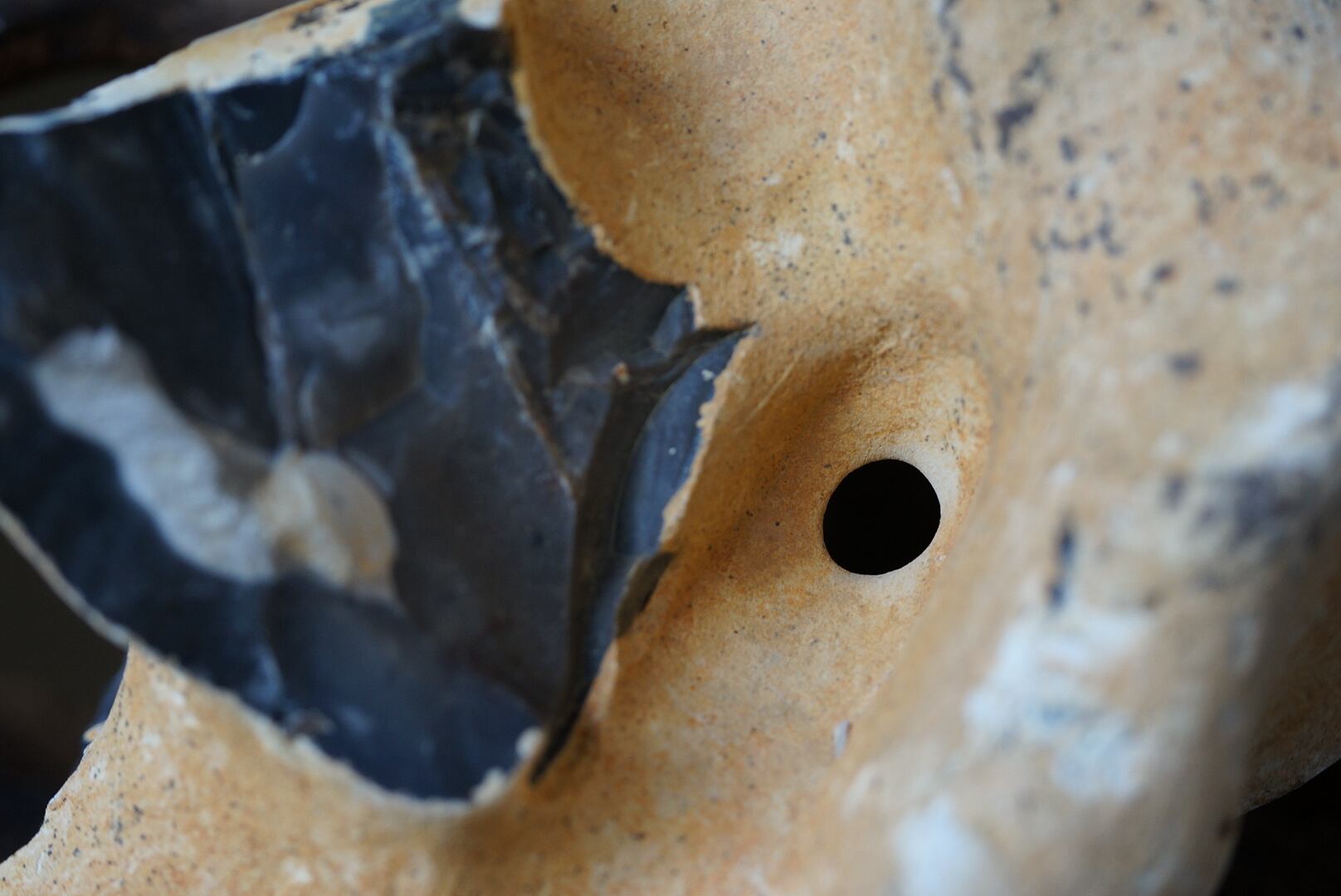 乳白色の表層と断面から覗く暗黒のコントラストが得体の知れない魅力を掻き立てています。
