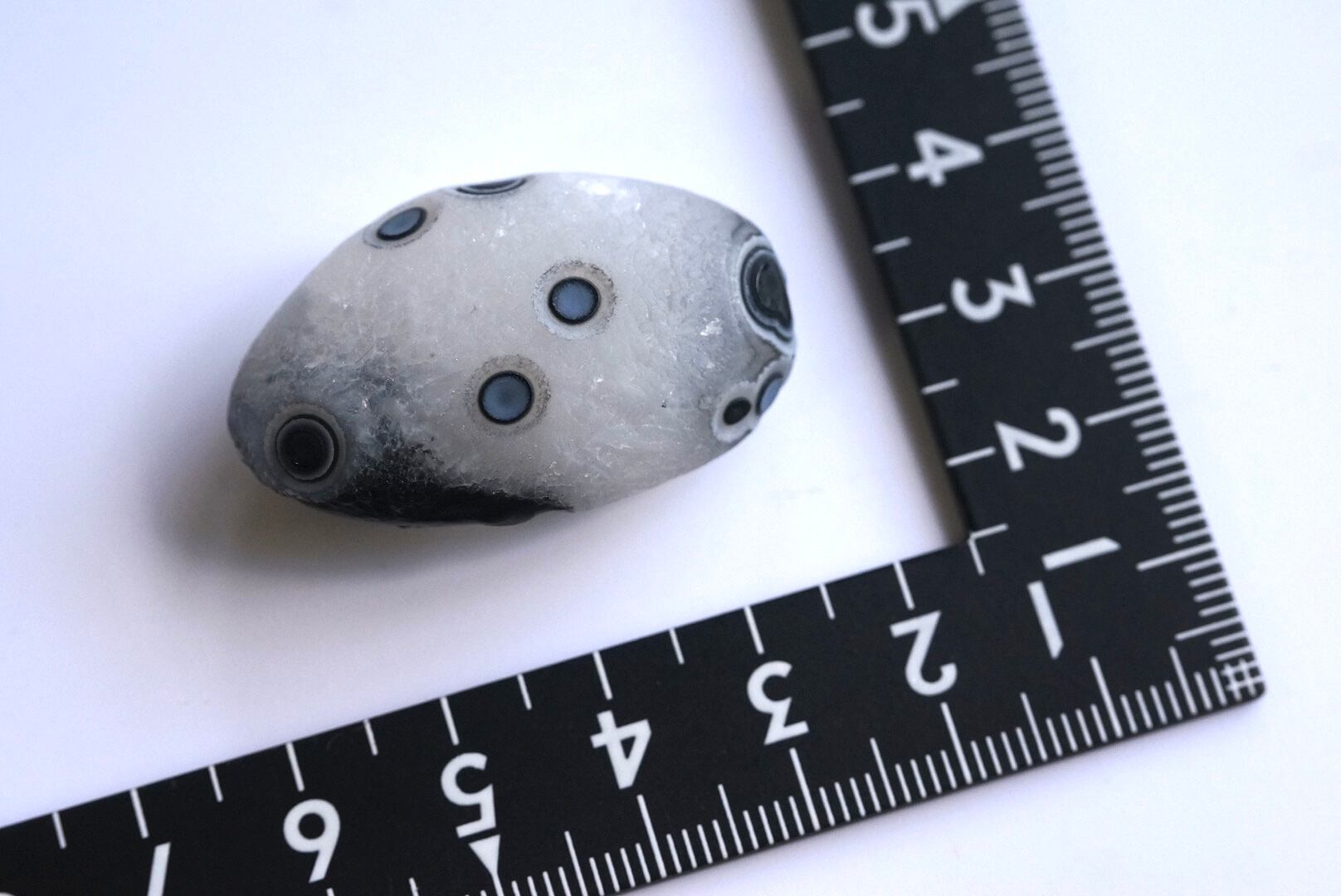 澄んだボディに鮮明な丸模様が美しく表れた白黒のゴビアゲートです。