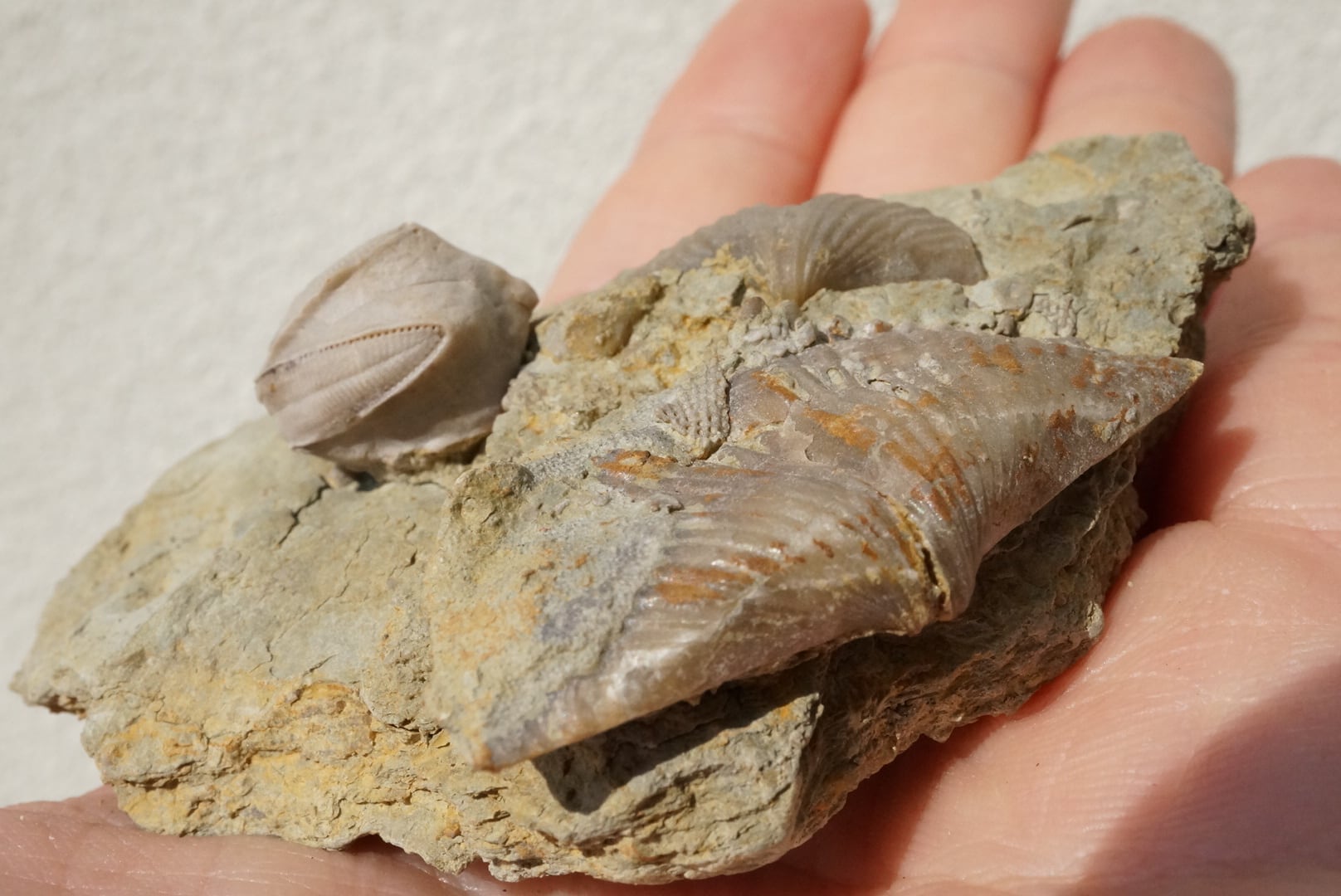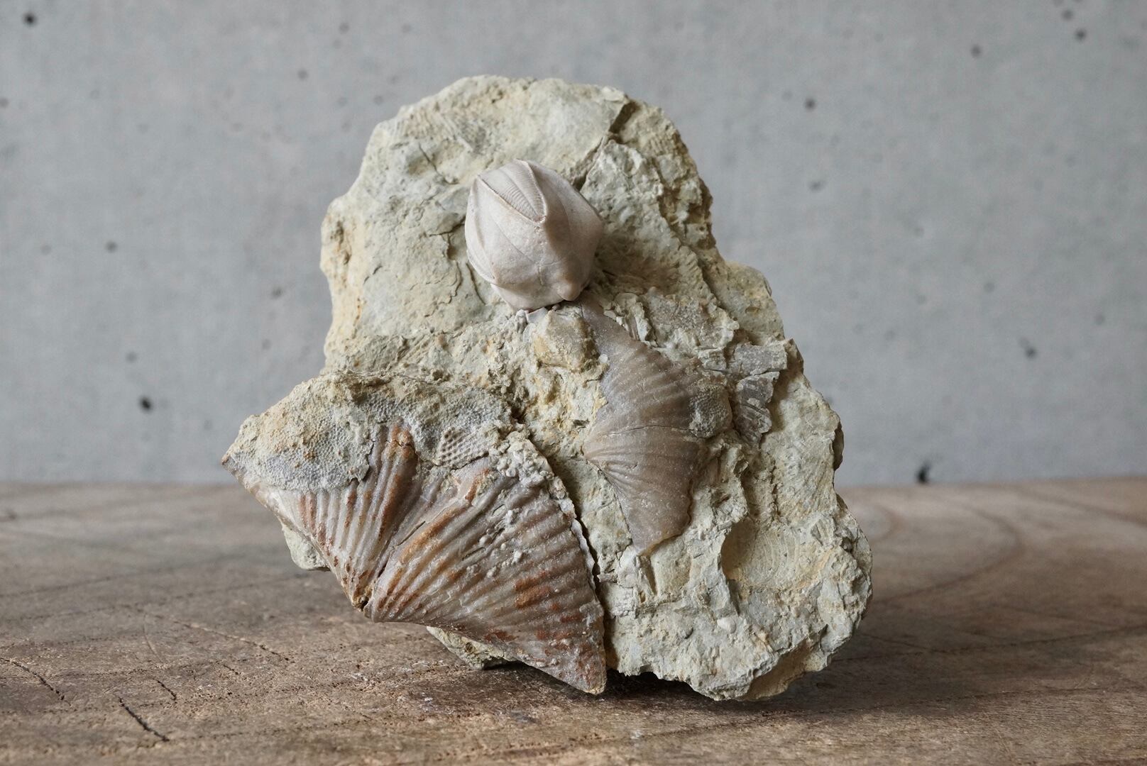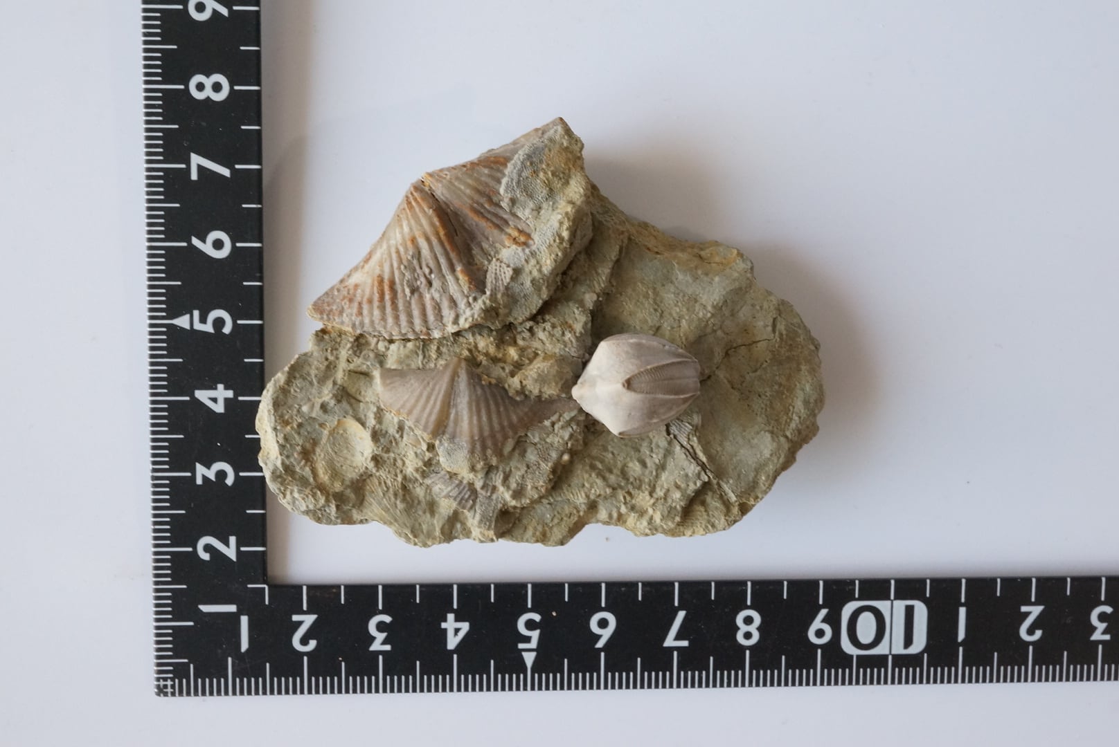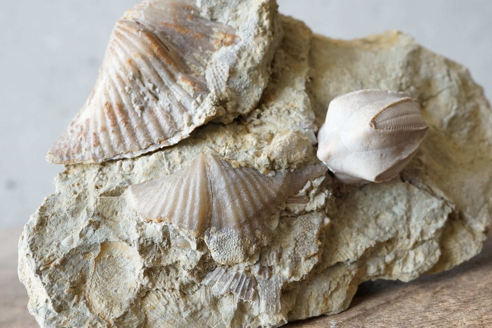 本石はウミツボミの他にも大小の腕足類 スピリフェリナや、網状のコケムシの化石も相席しています。