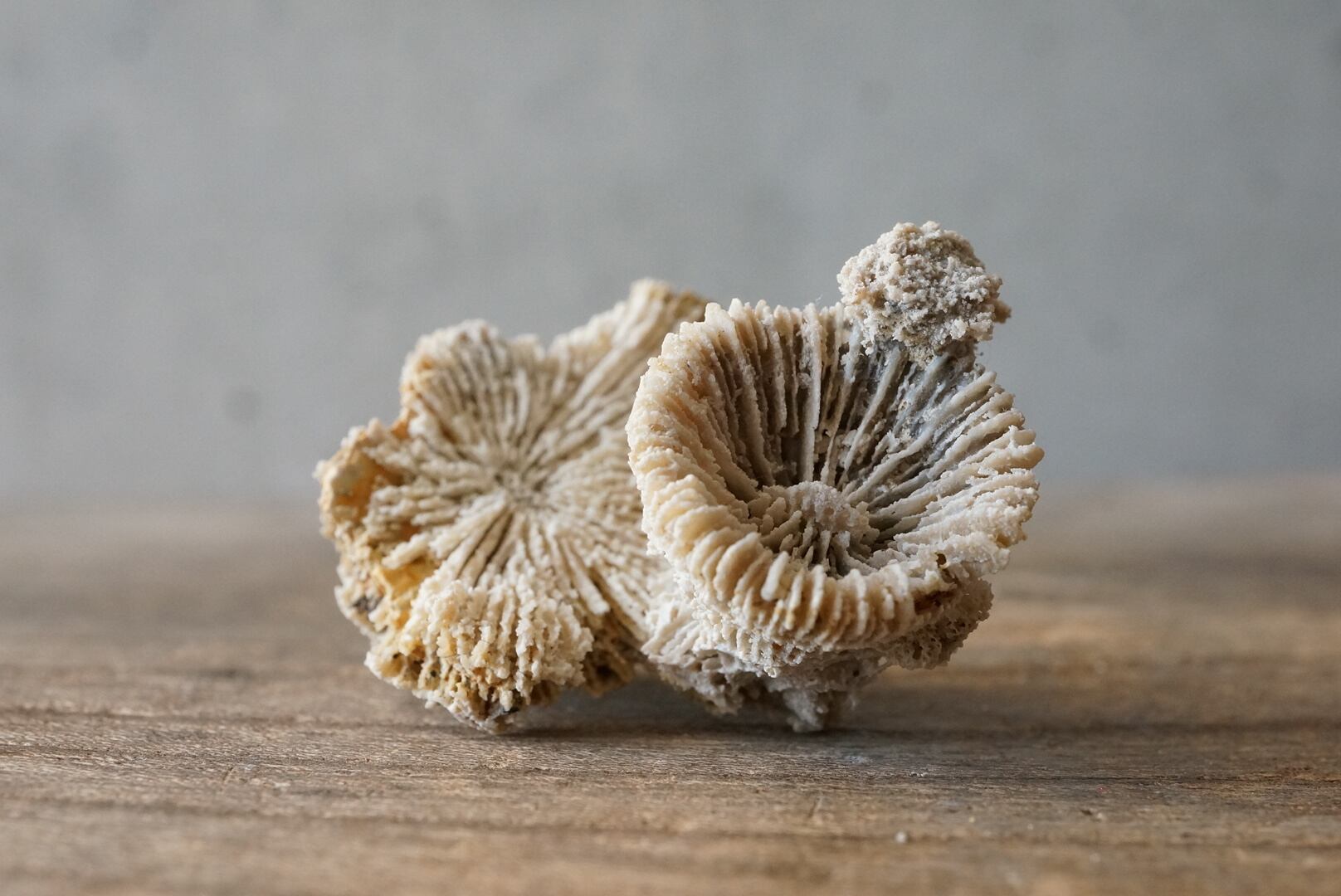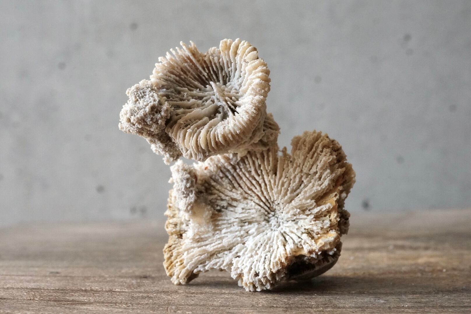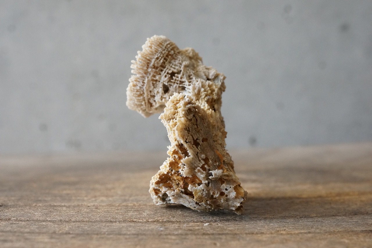 放射状に広がる骨格がパラボラを伸ばしたように立体的に保存された、ユニークな形状のサンゴ化石です。