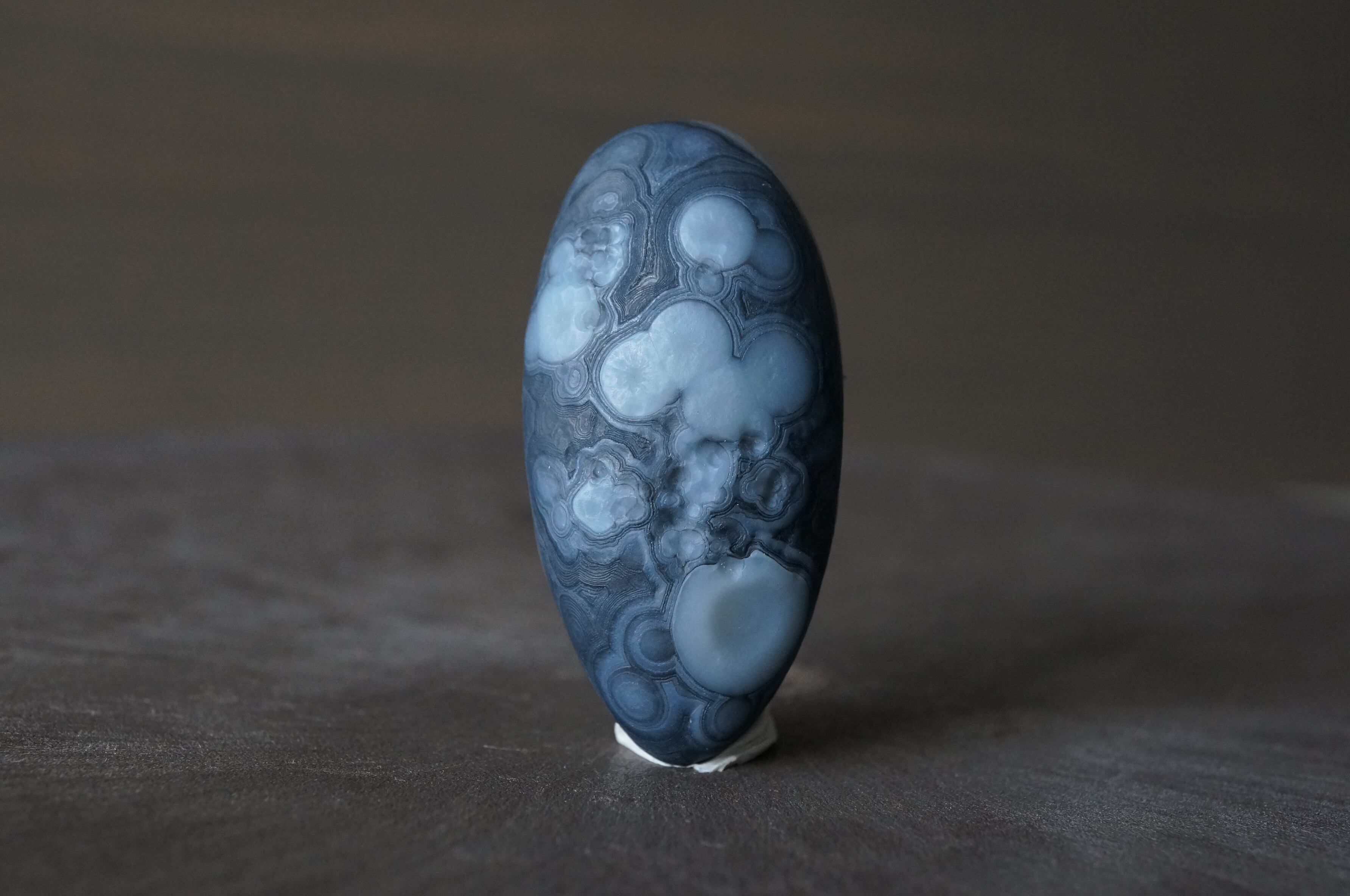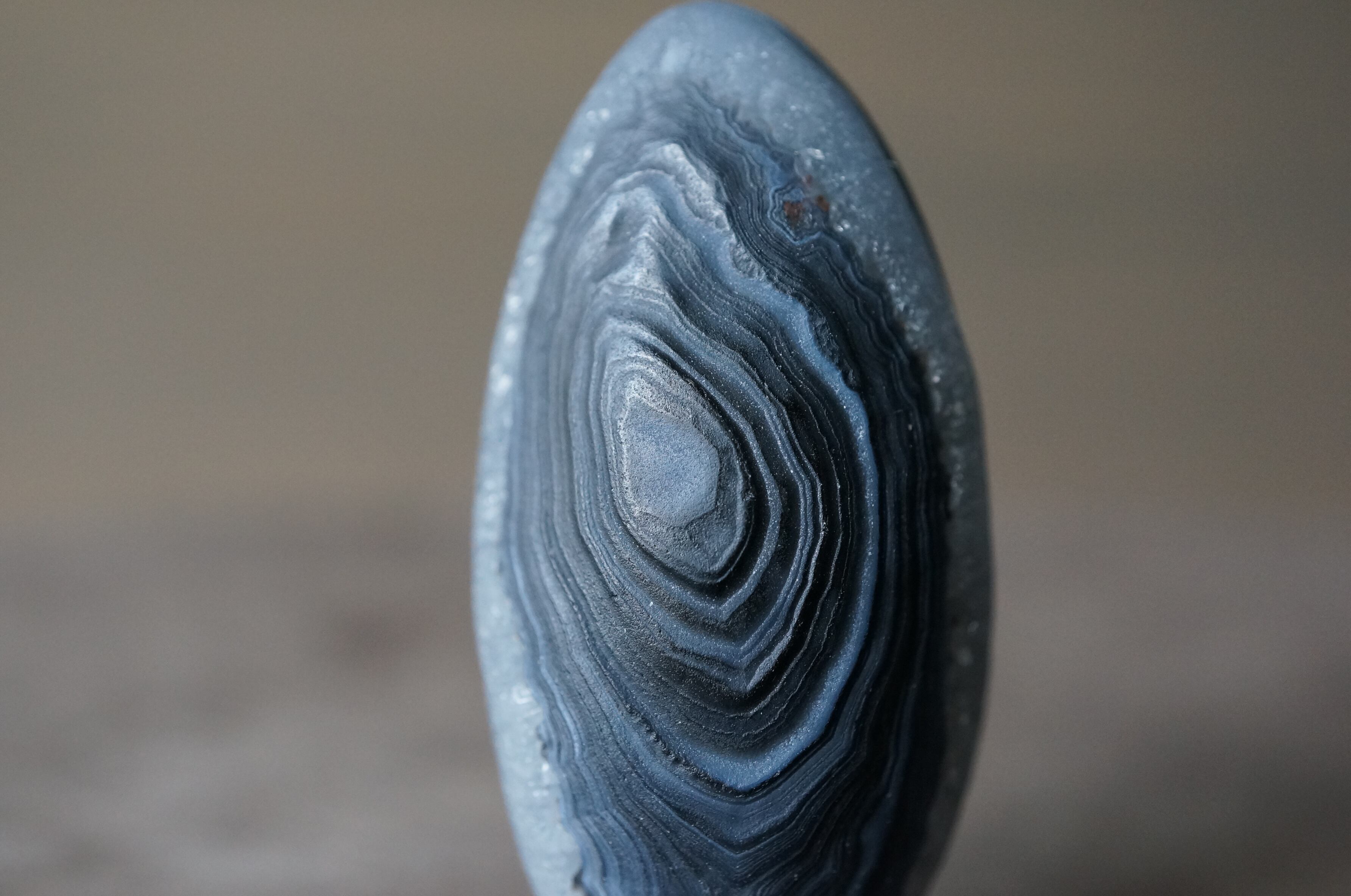 ムール貝のような縞模様を表す一面と、陰刻を伴う丸模様が表れた一面。