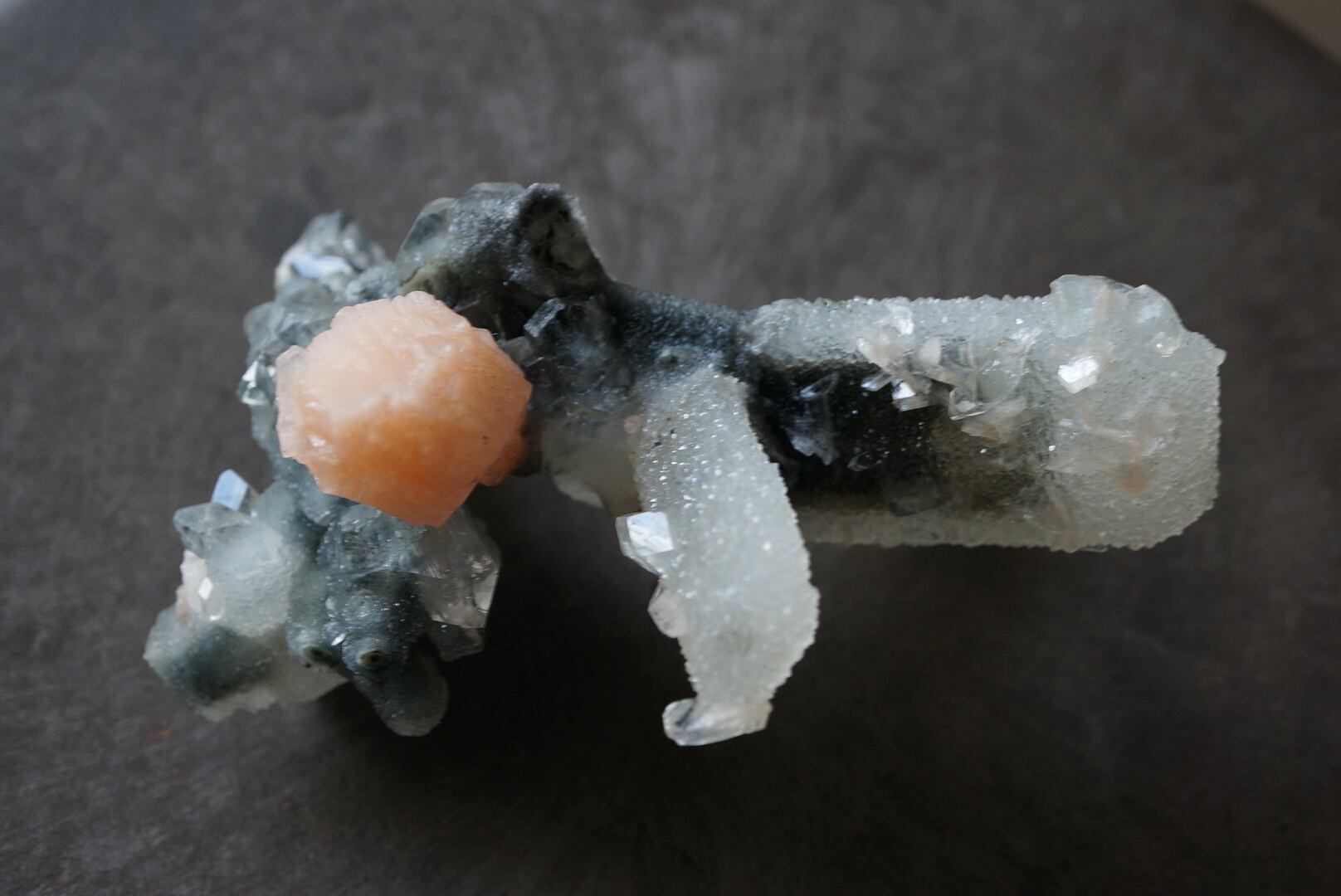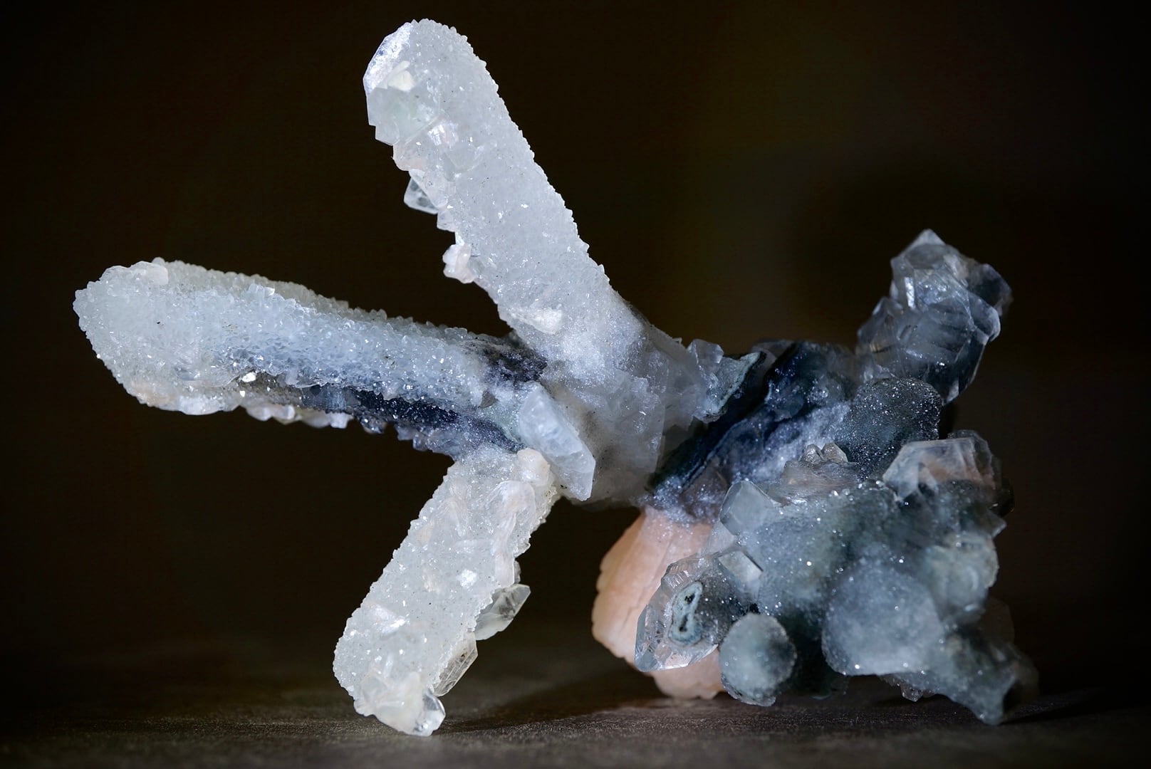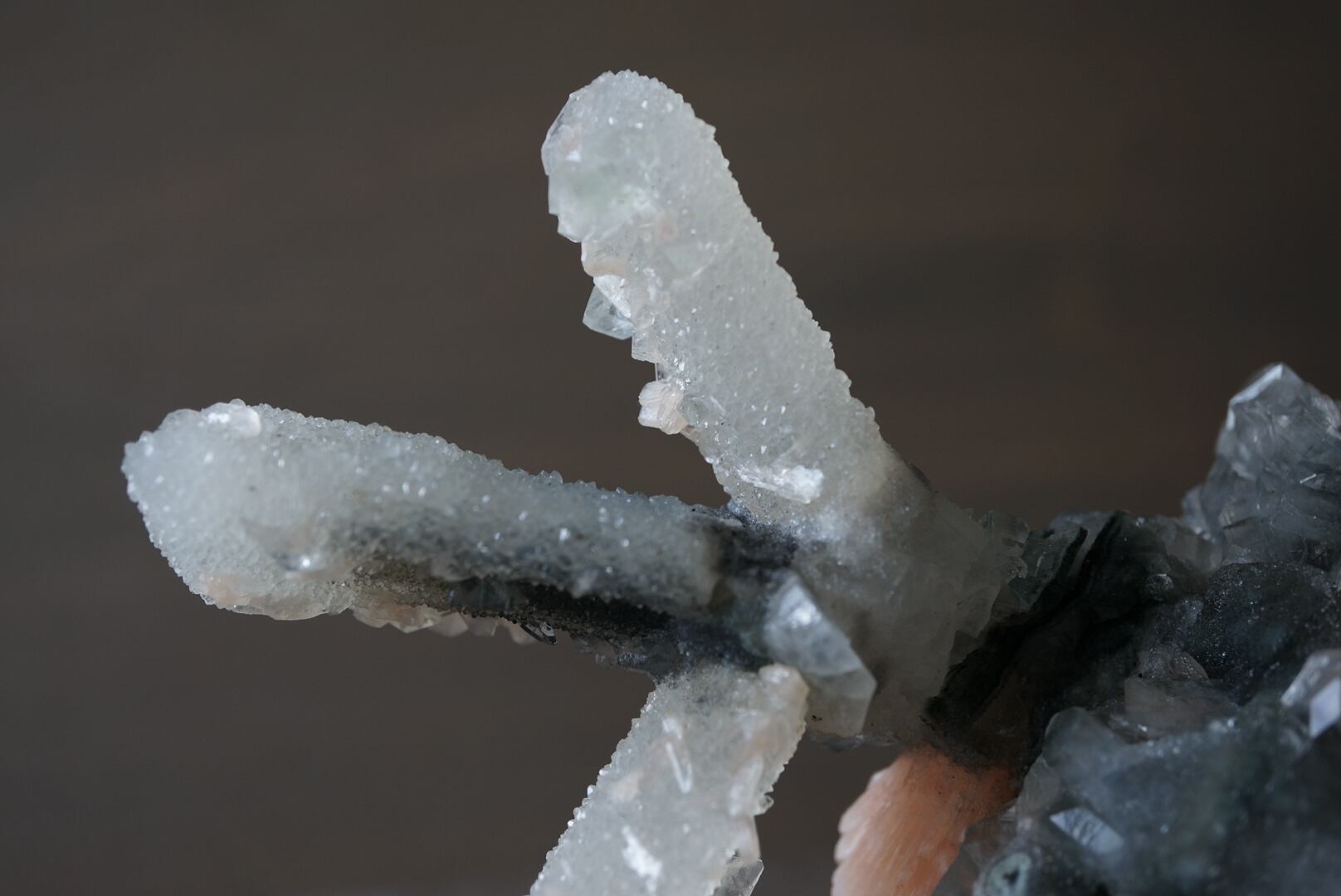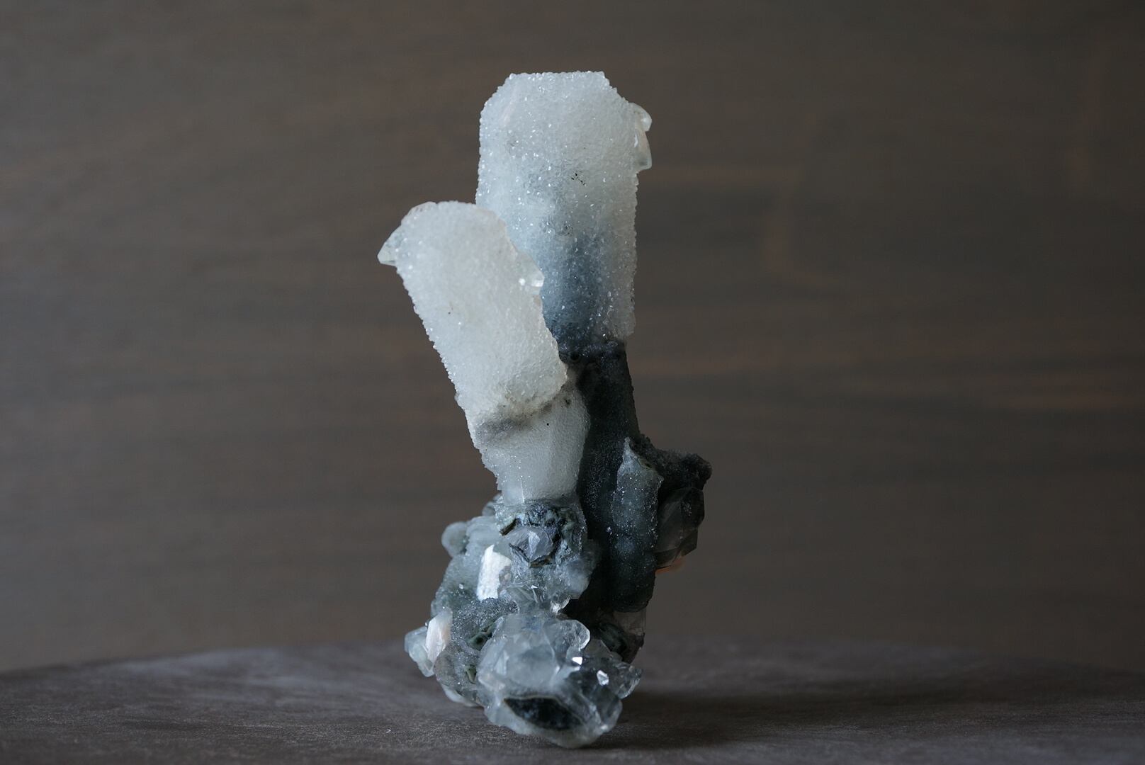 カルセドニーを骨組みに、共生するアポフィライトとスティルバイトがユニークな形を構成しています。