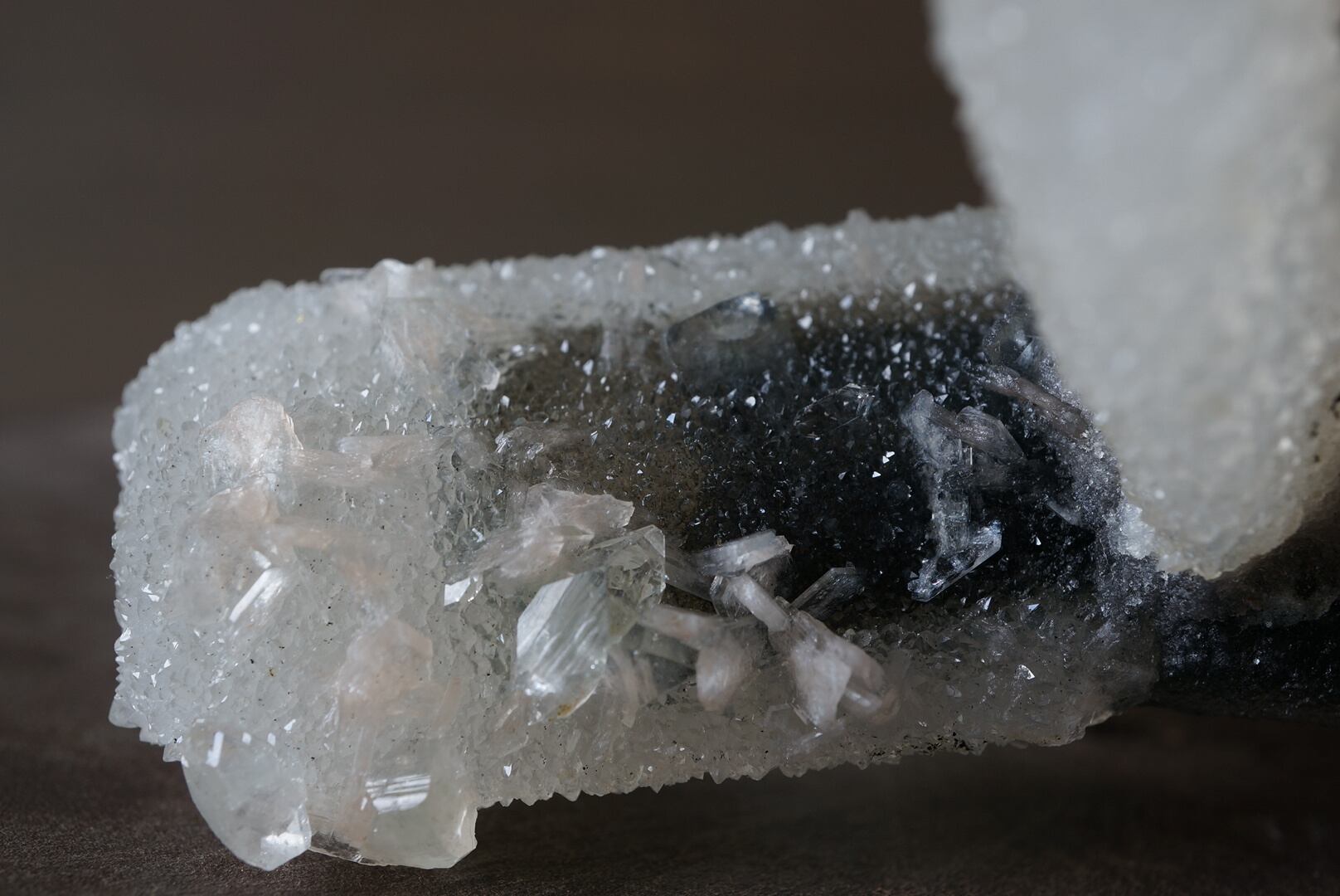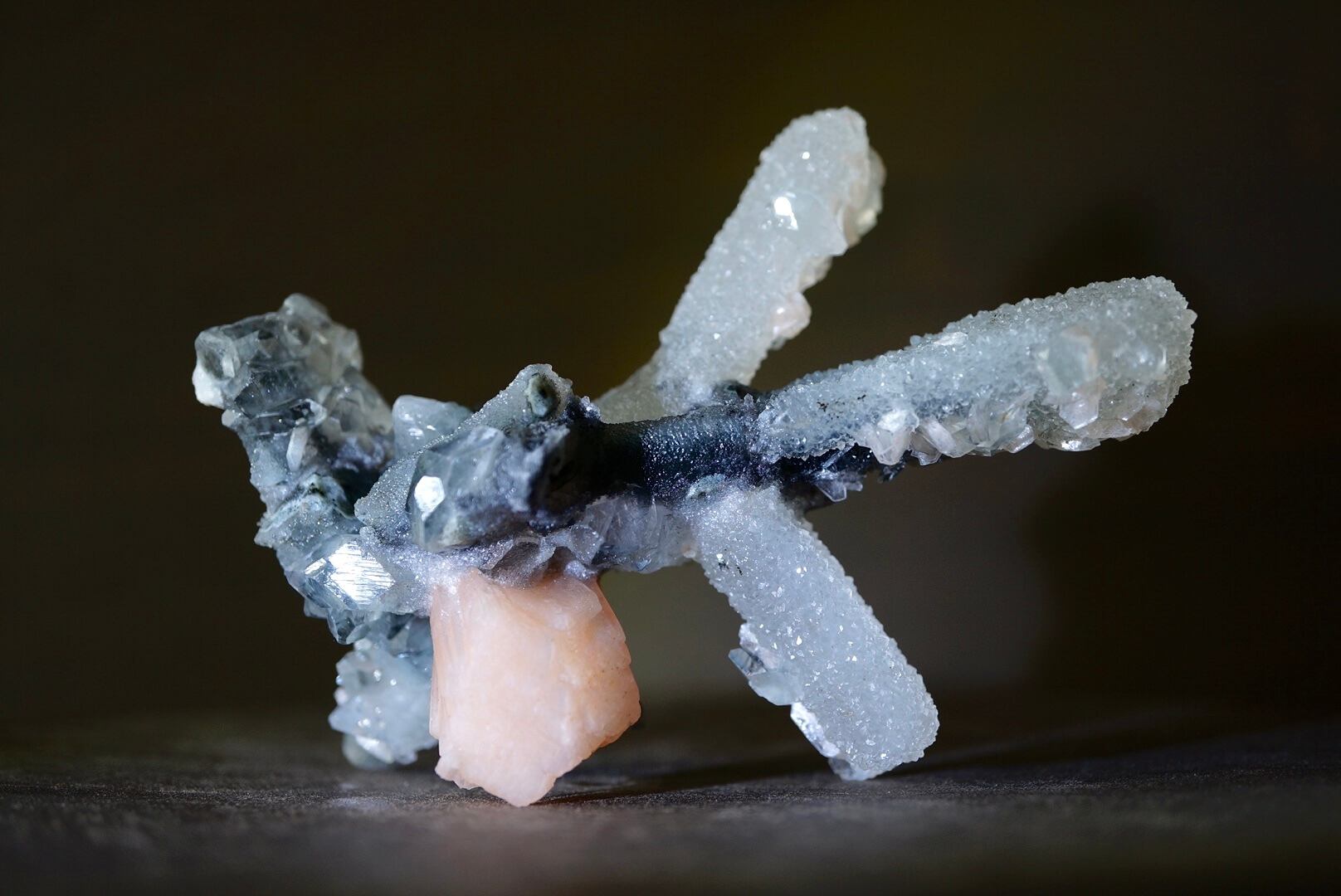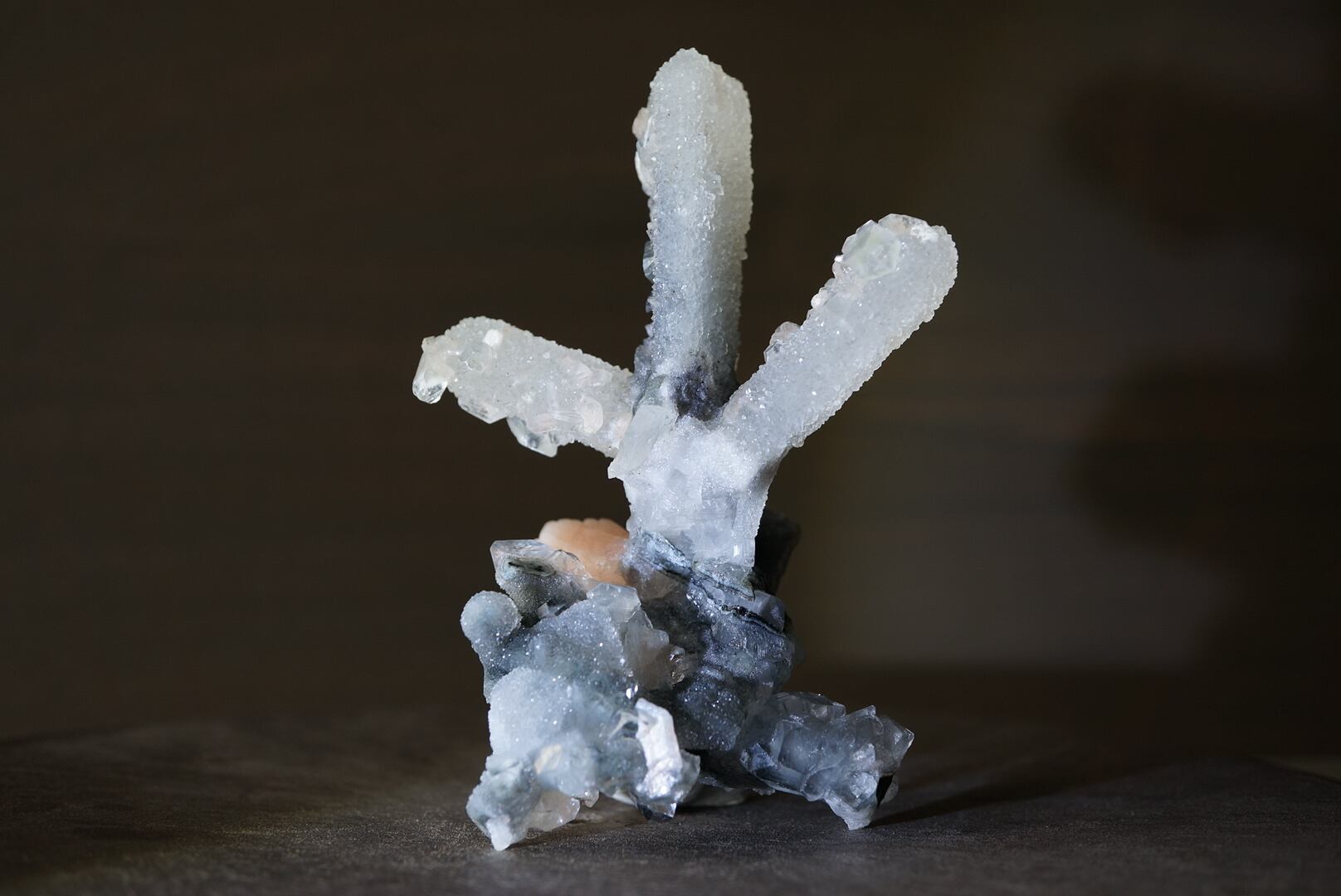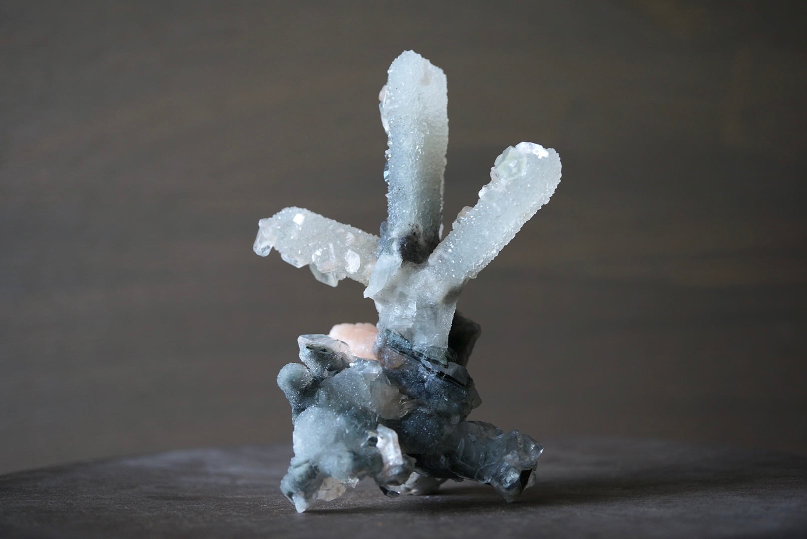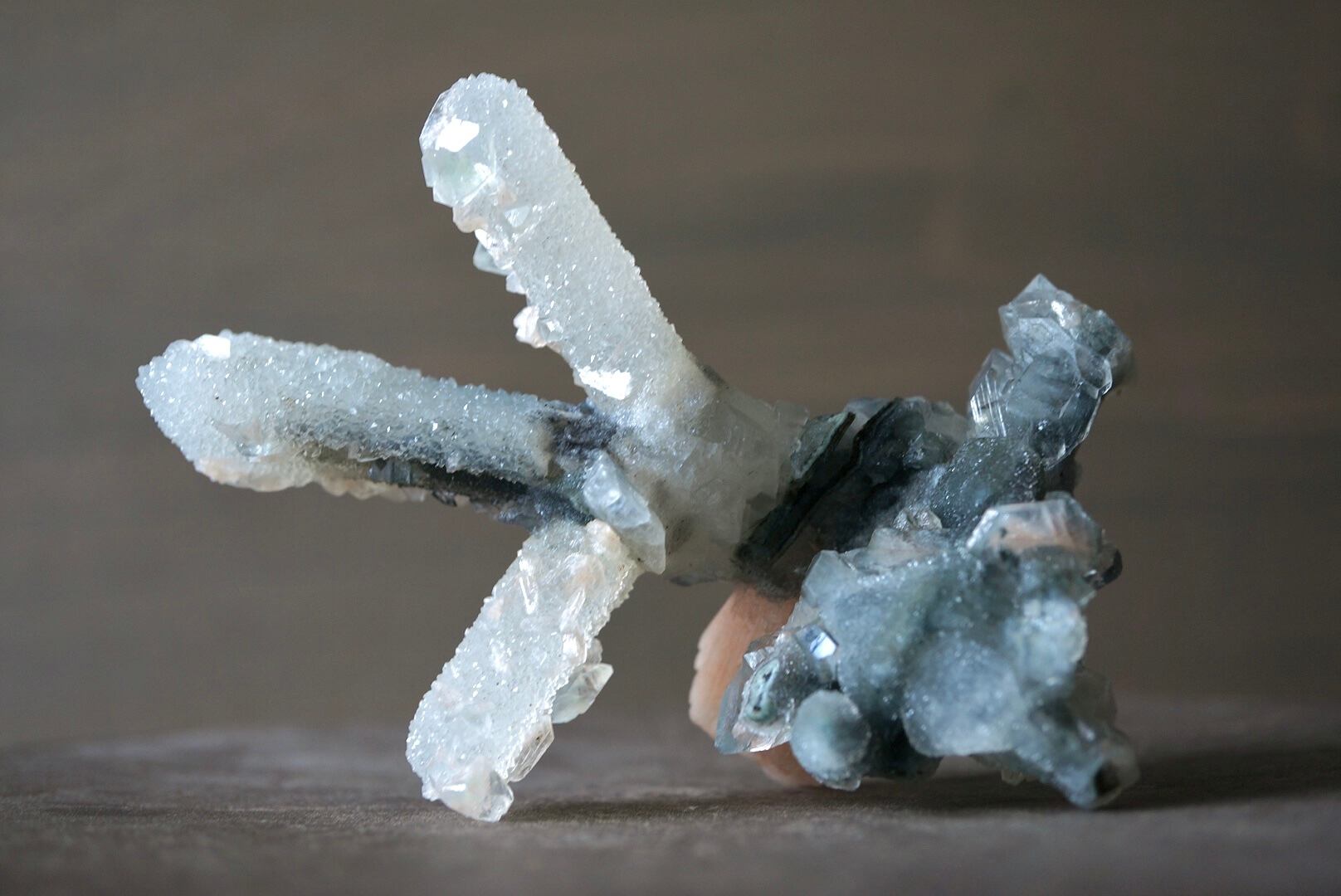 カルセドニーを骨組みに、共生するアポフィライトとスティルバイトがユニークな形を構成しています。