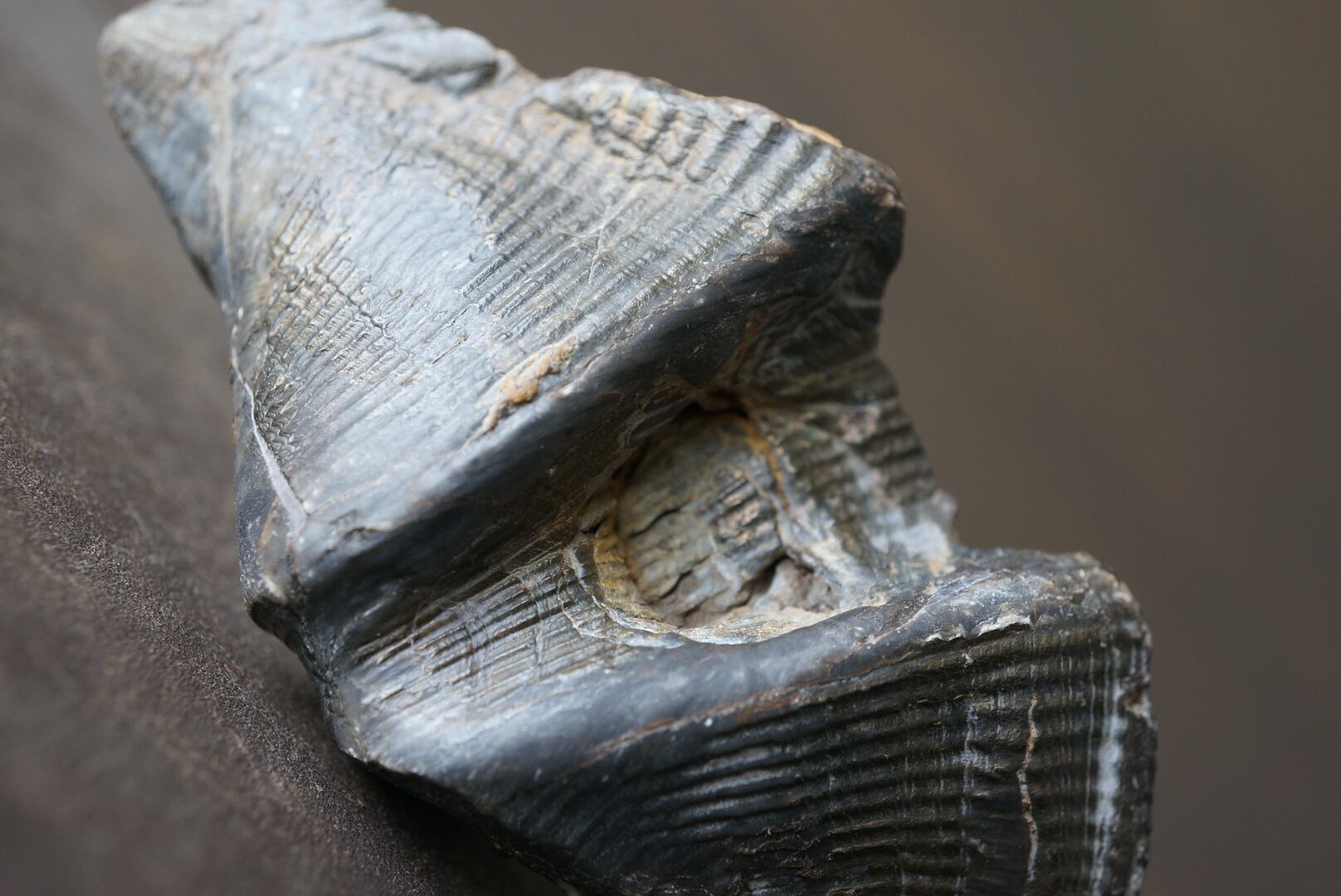本石は石灰質の腕足類の殻が部分的にパイライトに置換され、メタリックな光沢が覗いています。