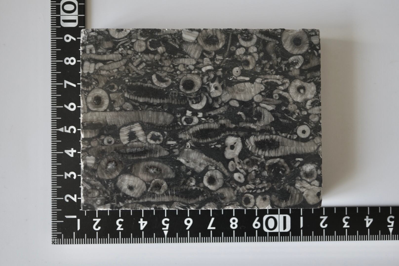 本石はウミユリの支持体(茎節)やクラウンの断片を含んだ石灰岩の断面。
